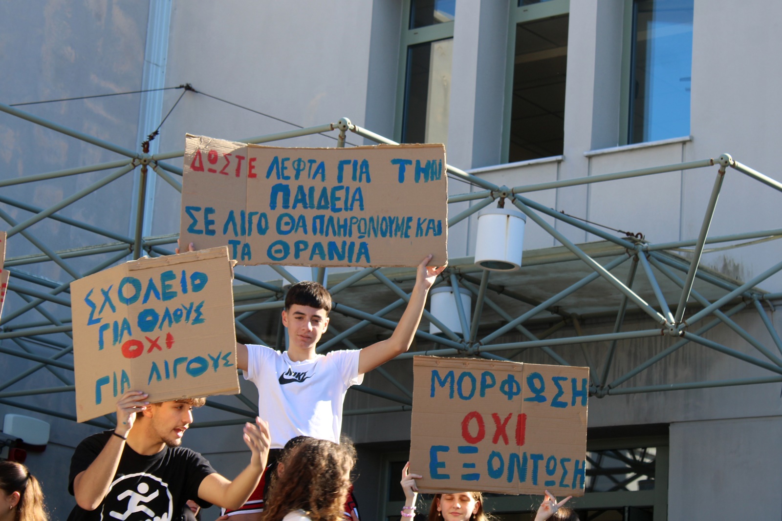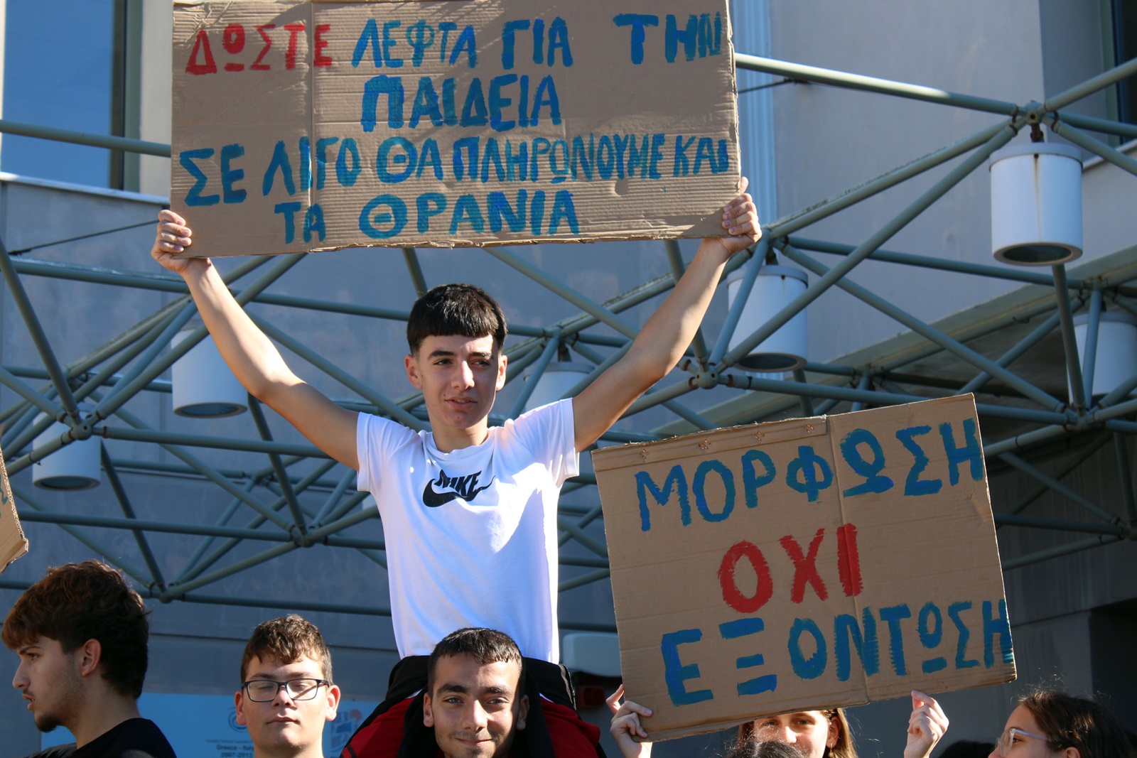 Στην κεφαλή της πορείας προπορεύονταν μαθητές του Μουσικού Σχολείου, παιανίζοντας το γνωστό αντιφασιστικό τραγούδι “Bella ciao”. Το πανό των μαθητών έγραφε: «Εμείς μιλάμε για γνώσεις και σπουδές, εσείς μιλάτε για κέρδη και ζημιές». Ενώ άλλα πλακάτ ανέγραφαν: «Όχι στις τριπλές Πανελλαδικές», «Δώστε λεφτά για την Παιδεία – σε λίγο θα πληρώνουμε και τα θρανία», «Μόρφωση, όχι εξόντωση», «Κούλη και Σοφία ακούστε καλά – οι μαθητές στους δρόμους ακόμα μια φορά».