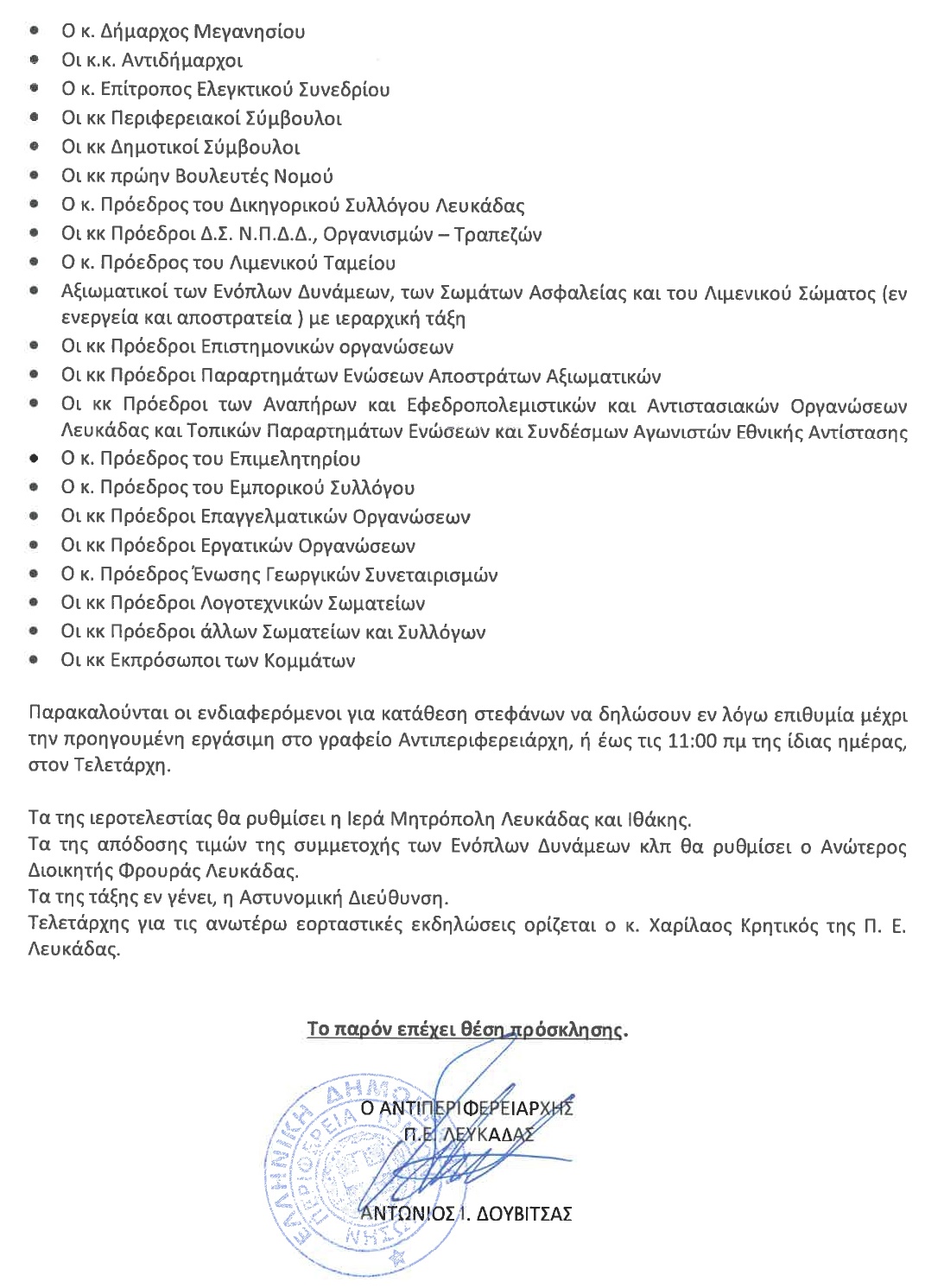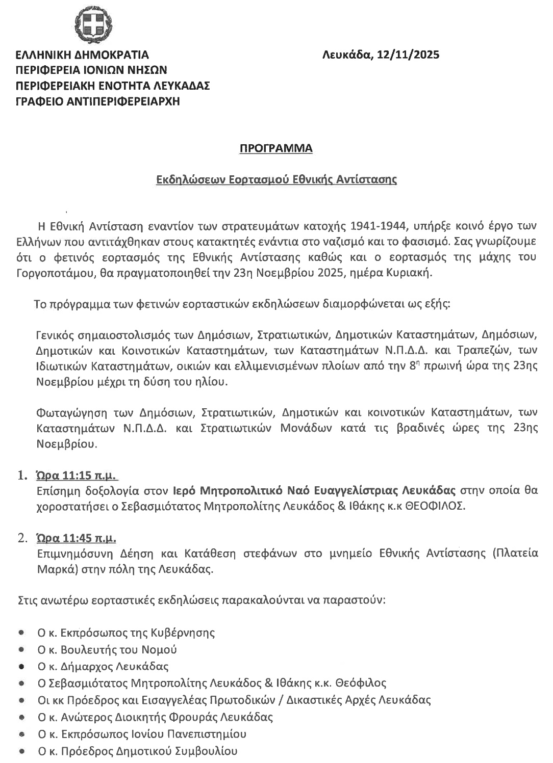 Το πρόγραμμα εκδηλώσεων του εορτασμού Εθνικής Αντίστασης όπως ανακοινώθηκε από την Περιφερειακή Ενότητα Λευκάδας.