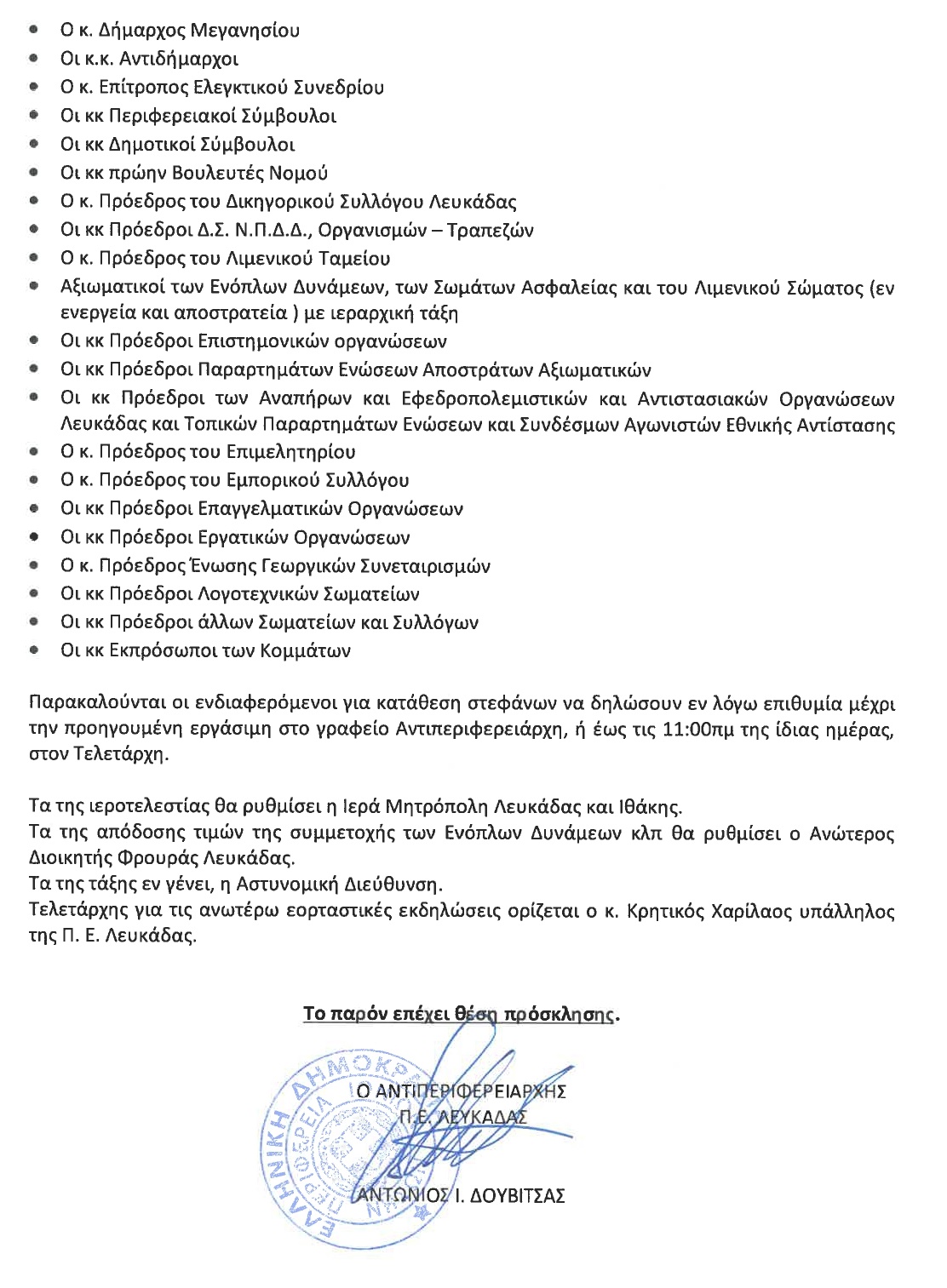 Το πρόγραμμα εκδηλώσεων του εορτασμού της Ημέρας των Ενόπλων Δυνάμεων όπως ανακοινώθηκε από την Περιφερειακή Ενότητα Λευκάδας.