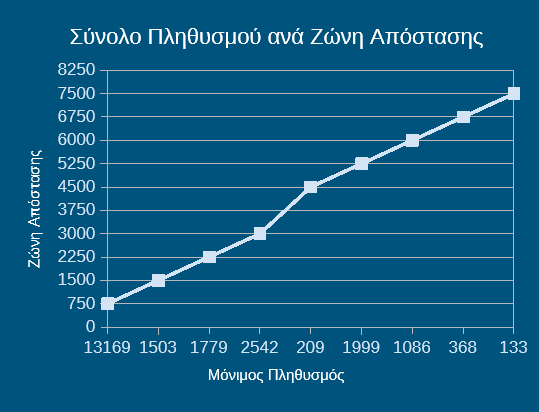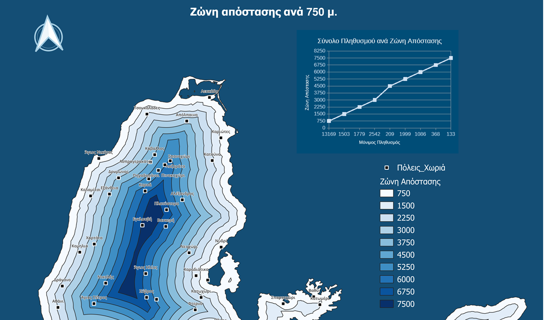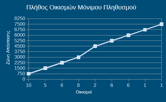 Με σημείο αναφοράς την ακτή και μετατοπίζοντας ανά ζώνη των 750 μ. την απόσταση προς την ενδοχώρα, αθροιστικά, ποια ζώνη είναι ή πιο πυκνό-κατοικημένη και που βρίσκονται αθροιστικά οι περισσότεροι οικισμοί.