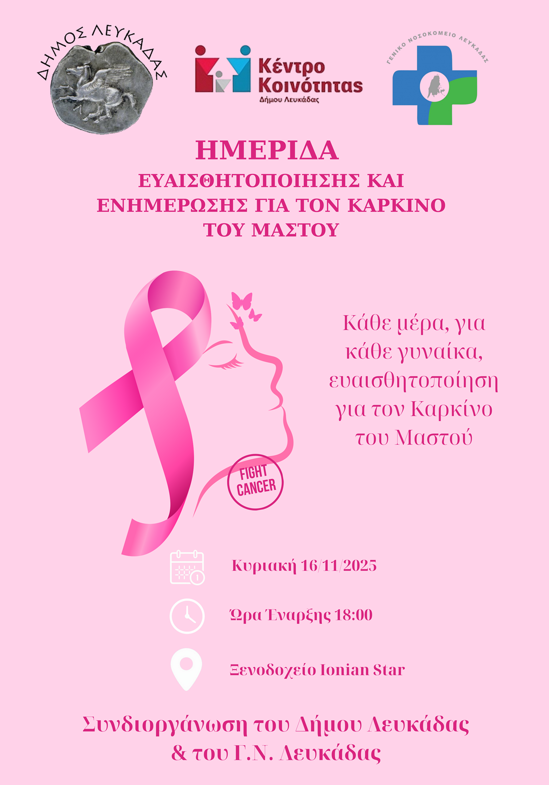 Την Κυριακή 16-11-2025 και ώρα 18:00 στο Ξενοδοχείο Ionian Star θα διεξαχθεί Ημερίδα Ευαισθητοποίησης και Ενημέρωσης για τον καρκίνο του μαστού, που θα πραγματοποιήσει ο Δήμος Λευκάδας σε συνεργασία με το Γενικό Νοσοκομείο Λευκάδας και το Κέντρο Κοινότητας του Δήμου Λευκάδας.