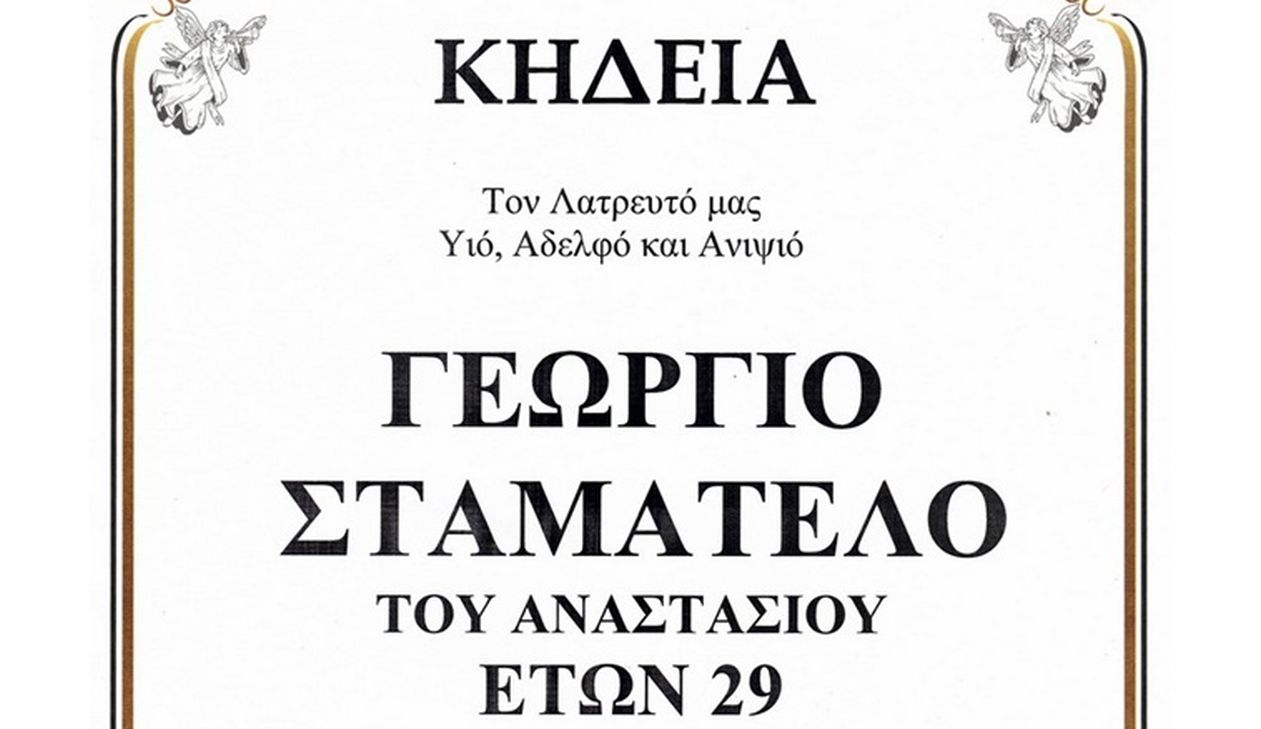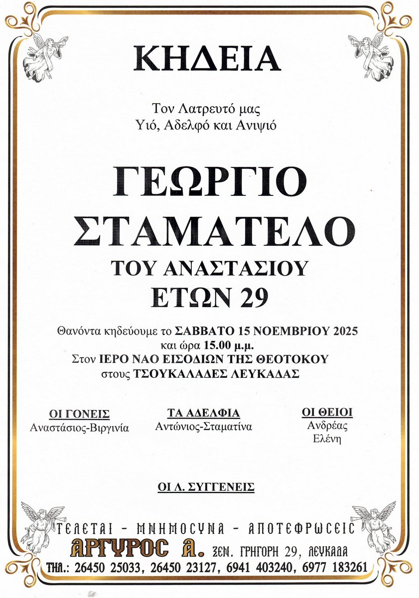 Αύριο, Σάββατο 15 Νοέμβρη 2025, στις 3:00 το απόγευμα, στον ενοριακό ναό Εισοδίων της Θεοτόκου, στους Τσουκαλάδες Λευκάδας, θα γίνει η κηδεία του Γεωργίου Σταματέλου του Αναστασίου που πέθανε σε ηλικία 29 ετών νικημένος από την επάρατη νόσο.