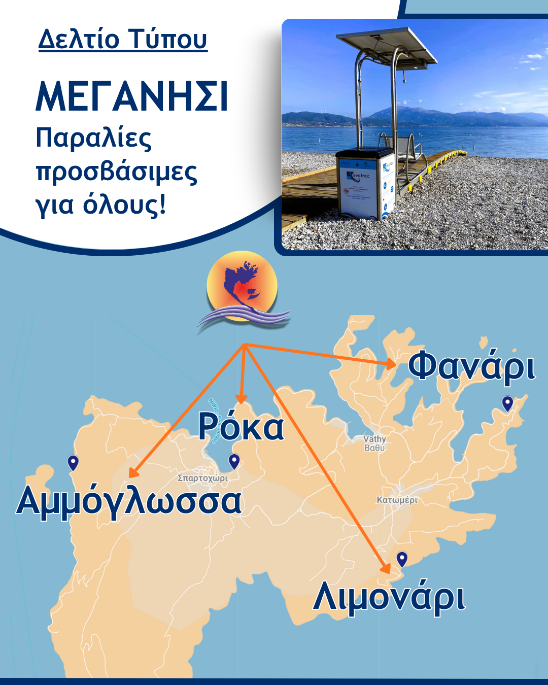Η παρέμβαση, αφορά τις παραλίες Αμμόγλωσσα, Ρόκα, Φανάρι και Λιμονάρι, και τις μετατρέπει σε χώρους πραγματικά ανοιχτούς και προσβάσιμους σε όλους, σηματοδοτώντας ένα ακόμη αποφασιστικό βήμα προς ένα Μεγανήσι χωρίς αποκλεισμούς. Με την τοποθέτηση των SeaTrack και τη δημιουργία πλήρως εξοπλισμένων προσβάσιμων παραλιών, διασφαλίζεται η ισότιμη συμμετοχή όλων των πολιτών, ανεξαρτήτως φυσικών δυνατοτήτων, στην απόλαυση του φυσικού πλούτου και της θάλασσας του νησιού μας.