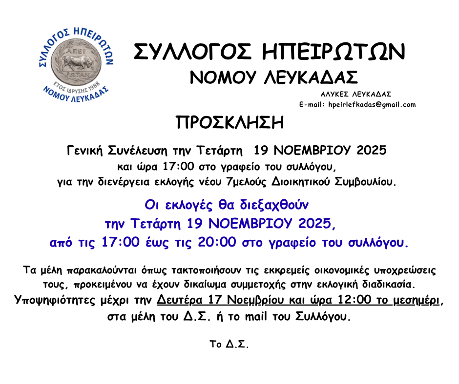 Γενική Συνέλευση και εκλογές θα πραγματοποιήσει την Τετάρτη 19 Νοέμβρη 2025 ο Σύλλογος Ηπειρωτών Νομού Λευκάδας.