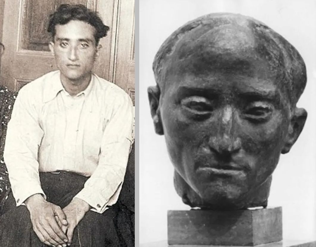 Ο ιστορικός Νίκος Σβορώνος σε νεαρή ηλικία και η προτομή του, που φιλοτέχνησε ο καλλιτέχνης, κατά τη διετία 1949-1950 (Αρχείο Μέμου Μακρή)