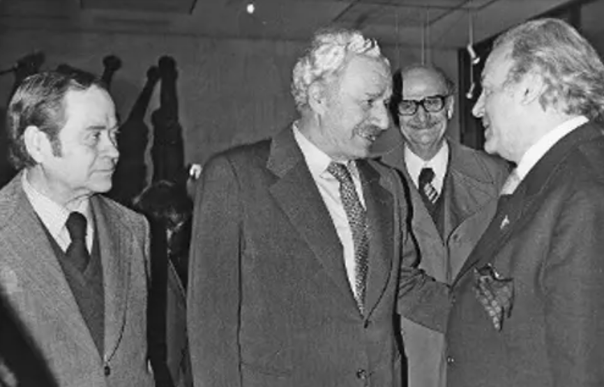 Ο αείμνηστος ΓΓ της ΚΕ του ΚΚΕ Χαρίλαος Φλωράκης συνομιλεί με τον Μέμο Μακρή, υπό το βλέμμα του χαράκτη Τάσσου και του καπετάνιου της Αντίστασης Νίκανδρου Κεπέση (Αρχείο «Ριζοσπάστη»)