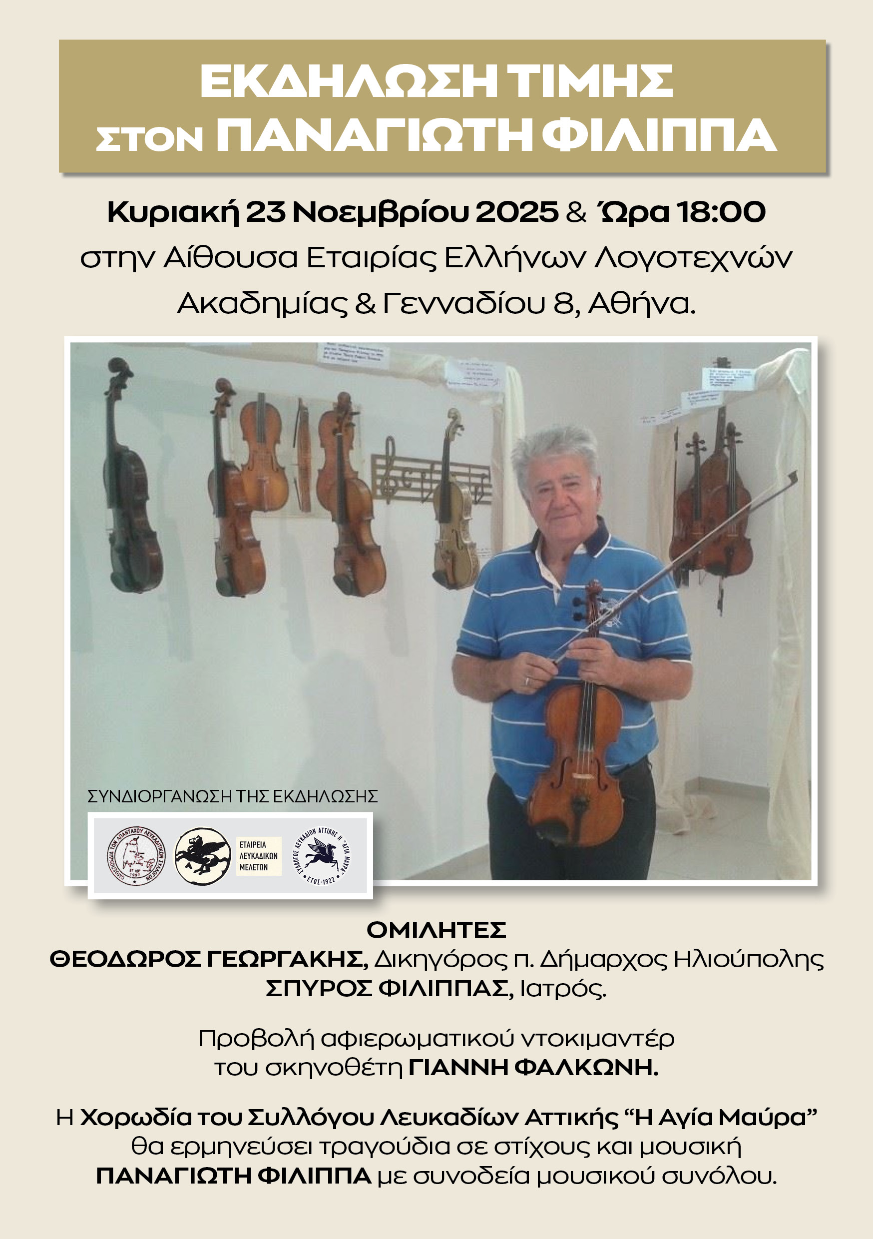 H Ομοσπονδία των Απανταχού Λευκαδίτικων Συλλόγων, η Εταιρεία Λευκαδικών Μελετών και ο Σύλλογος Λευκαδίων Αττικής «Η Αγία Μαύρα» διοργανώνουν την Κυριακή 23-11-2025 και ώρα 18:00 στην Αίθουσα της Εταιρείας Ελλήνων Λογοτεχνών, Ακαδημίας & Γενναδίου 8, Αθήνα, τιμητική εκδήλωση αφιερωμένη στον άξιο Λευκαδίτη μουσικό Παναγιώτη Φίλιππα.