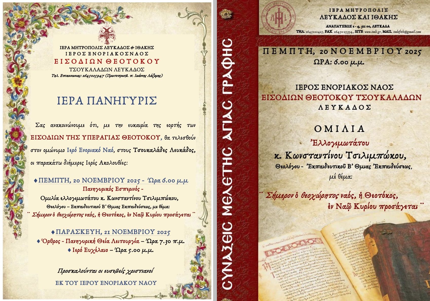 Oμιλία ελλογιμωτάτου κ. Κωνσταντίνου Τσιλιμπώκου, Θεολόγου – Eκπαιδευτικού Β ̓Θμιας Εκπαιδεύσεως, με θέμα: «Σήμερον ὁ θεοχώρητος ναός, ἡ Θεοτόκος, ἐν Ναῷ Κυρίου προσάγεται».
