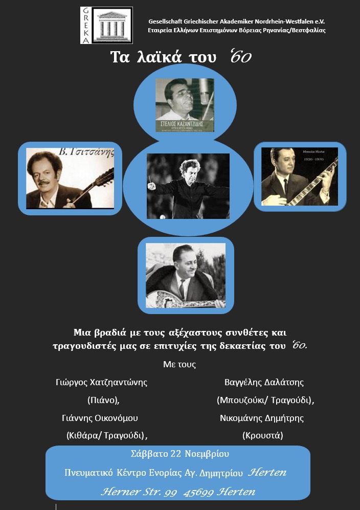 Το Σάββατο 22 Νοεμβρίου 2025, στον ίδιο χώρο, θα πραγματοποιηθεί η εκδήλωση «Τα λαϊκά του 60» που διοργανώνει η εταιρεία Ελλήνων Επιστημόνων Βόρειας Ρηνανίας – Βεστφαλίας.