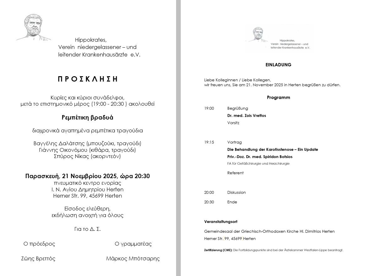 Θα προηγηθεί στις 18:00-19:30 το επιστημονικό μέρος της εκδήλωσης με την εισήγηση «Η αντιμετώπιση της καρωτιδικής στένωσης – Μια ενημέρωση», του Λέκτορα (Priv.-Doz.) Δρ. Ιατρικής Σπυρίδωνα Μπότσιου, Ειδικού στη Αγγειοχειρουργική και Καρδιοχειρουργική.