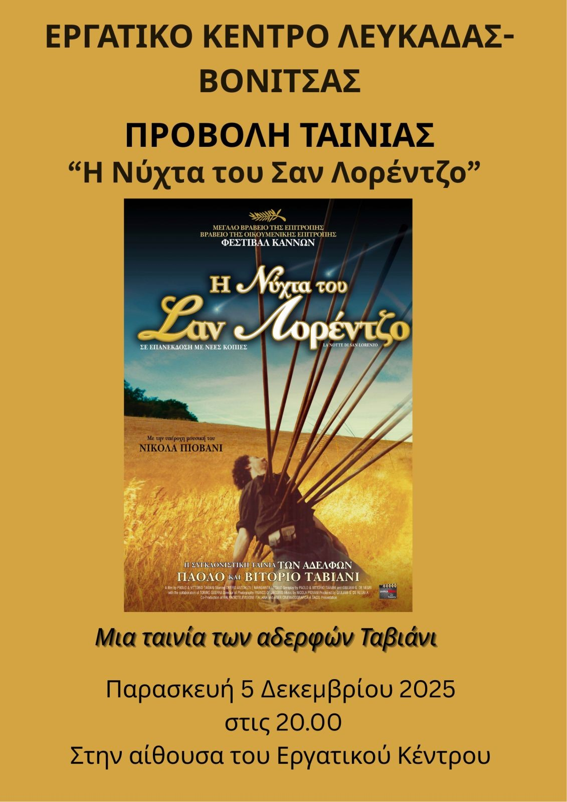 Την Παρασκευή 5 Δεκεμβρίου 2025, στις 20.00, το Εργατικό Κέντρο Λευκάδας-Βόνιτσας θα παρουσιάσει ένα μικρό αφιέρωμα στους αδελφούς Ταβιάνι, προβάλλοντας την ταινία τους «Η Νύχτα του Σαν Λορέντζο» (1982, 106’), βραβευμένη στις Κάννες το 1984 με το Μεγάλο Βραβείο της Επιτροπής.