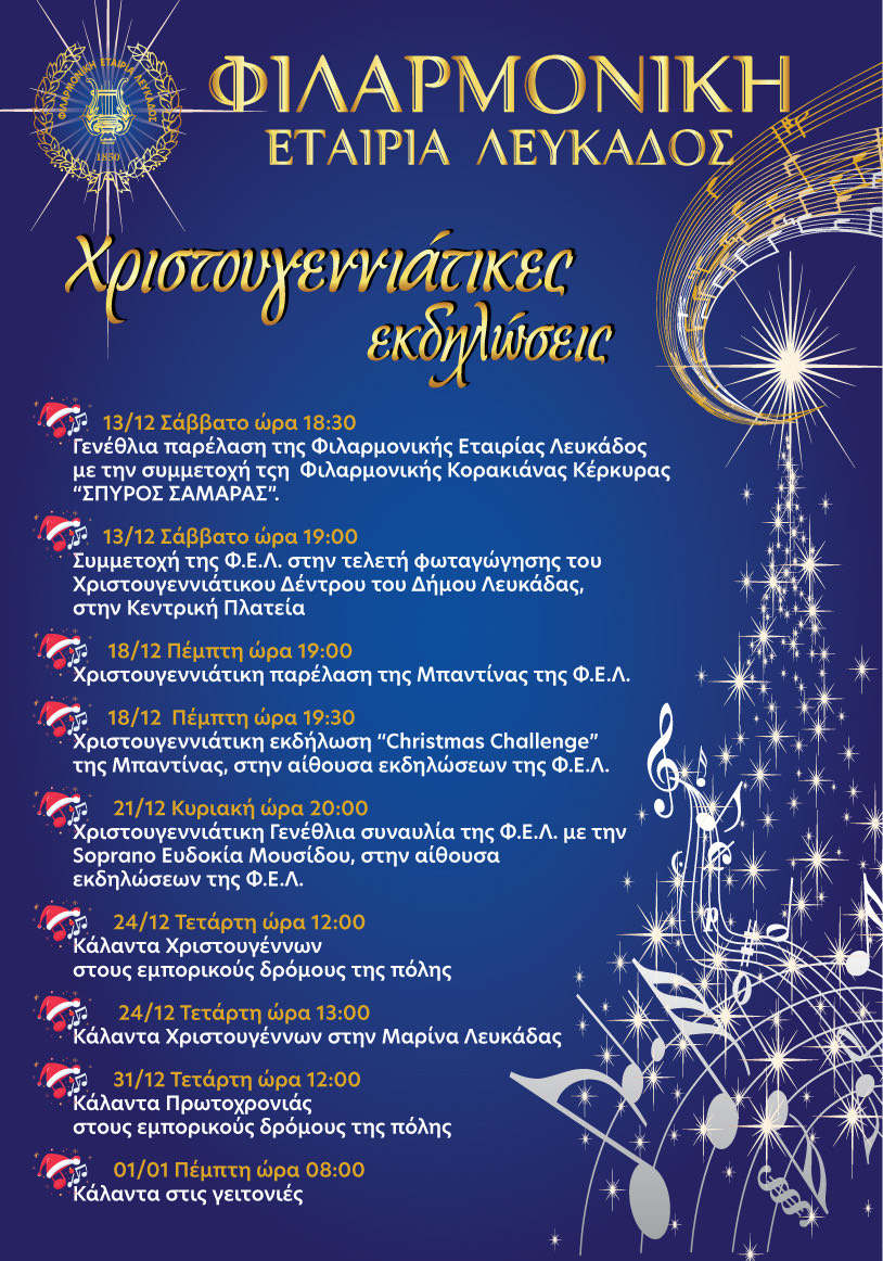 Παρατίθεται το πρόγραμμα των Χριστουγεννιάτικων εκδηλώσεων της Φιλαρμονικής Εταιρείας Λευκάδας.