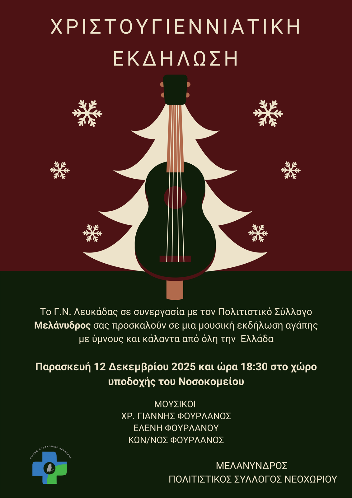Το Γενικό Νοσοκομείο Λευκάδας, σε συνεργασία με τον Πολιτιστικό Σύλλογο Νεοχωρίου «Μελάνυνδρος», διοργανώνει μια ξεχωριστή μουσική εκδήλωση αγάπης την Παρασκευή 12 Δεκεμβρίου 2025, ώρα 18:30, στον χώρο υποδοχής του Νοσοκομείου.
