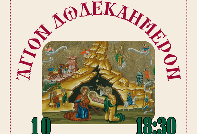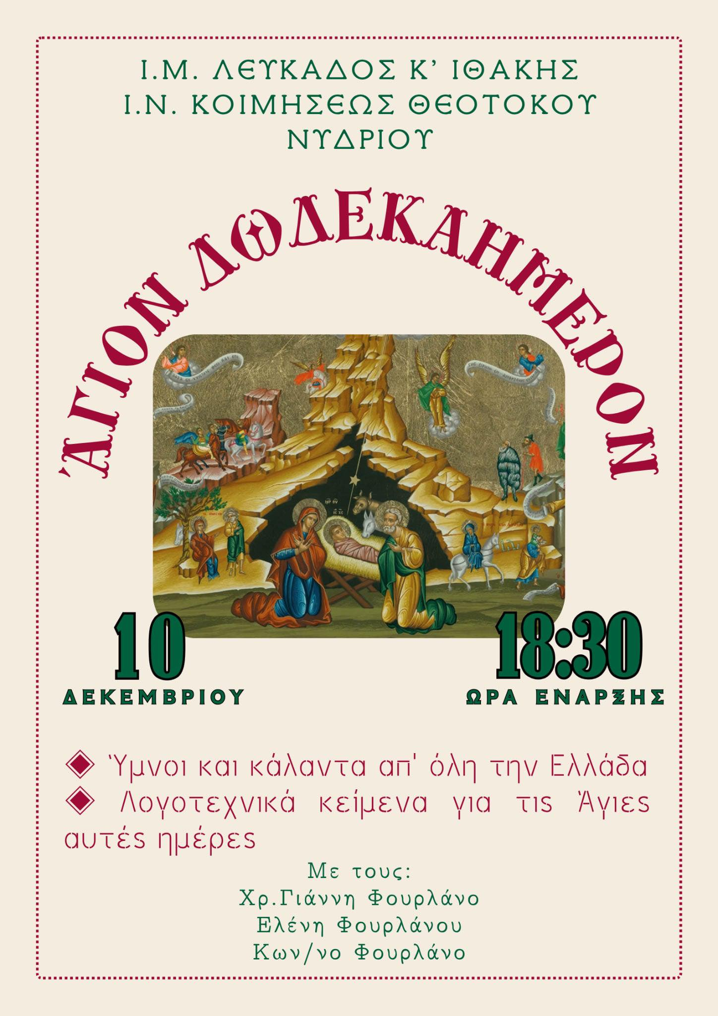 Η Ιερά Μητρόπολη Λευκάδος και Ιθάκης και ο Ιερός Ναός Κοιμήσεως της Θεοτόκου Νυδριού διοργανώνουν την Τετάρτη 10 Δεκεμβρίου 2025, στις 18:30, εκδήλωση με Ύμνους και Κάλαντα απ΄ όλη την Ελλάδα και λογοτεχνικά κείμενα για τις Άγιες αυτές ημέρες με τους Χρ. Γιάννη Φουρλάνο, Ελένη Φουρλάνου και Κωνσταντίνο Φουρλάνο.