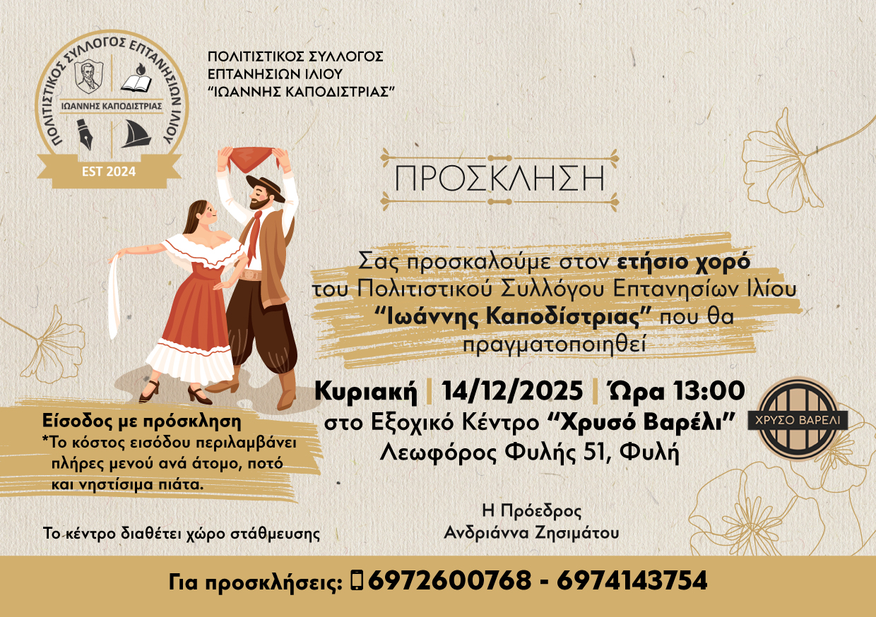 Ο Σύλλογος Επτανησίων Ιλίου «Ιωάννης Καποδίστριας» προσκαλεί στον ετήσιο χορό του που θα πραγματοποιηθεί την Κυριακή 14 Δεκεμβρίου 2025, ώρα 13:00, στο Εξοχικό Κέντρο «Χρυσό Βαρέλι» (Λεωφόρος Φυλής 51, Φυλή).
