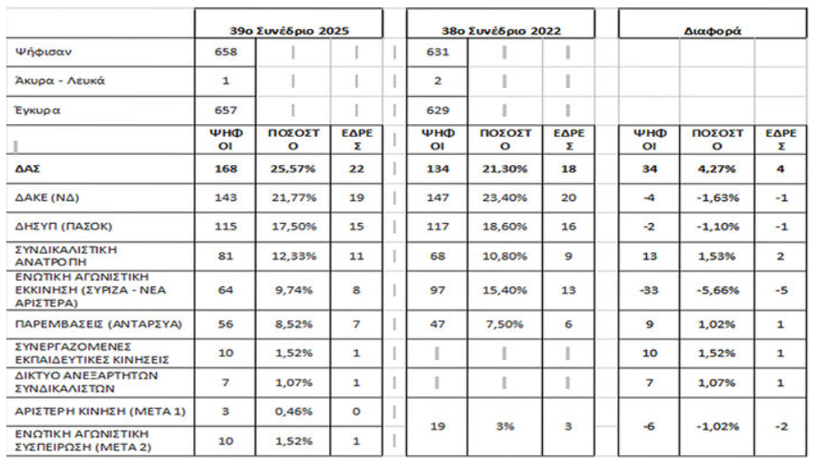 Η ΔΑΣ, που το ψηφοδέλτιό της συγκροτείται με συνδικαλιστές που συσπειρώνονται στο Π.Α.ΜΕ. με μεγάλη άνοδο σε ψήφους, ποσοστά και έδρες – από 134 ψήφους, 21,3% και 18 έδρες το 2022 σε 168 ψήφους, 22 έδρες και 25,57% – αναδείχθηκε πρώτη δύναμη γκρεμίζοντας την κυβερνητική παράταξη της ΔΑΚΕ από αυτή τη θέση.