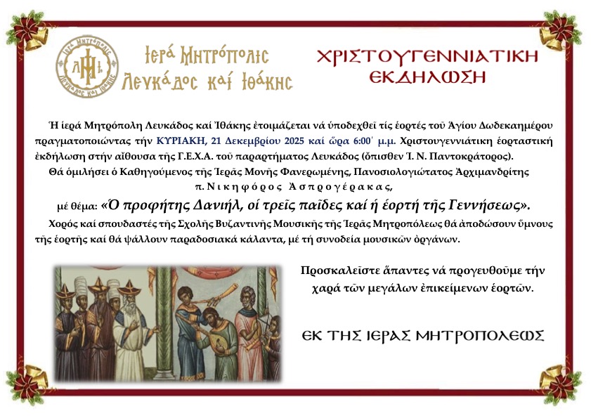 Ἡ ἱερά Μητρόπολη Λευκάδος καί Ἰθάκης ἐτοιμάζεται νά ὑποδεχθεῖ τίς ἑορτές τοῦ Ἁγίου Δωδεκαημέρου πραγματοποιώντας τήν ΚΥΡΙΑΚΗ, 21 Δεκεμβρίου 2025 καί ὥρα 6:00 μ.μ. Χριστουγεννιάτικη ἑορταστική ἐκδήλωση στήν αἴθουσα τῆς Γ.Ε.Χ.Α. τοῦ παραρτήματος Λευκάδος (ὄπισθεν Ἱ. Ν. Παντοκράτορος).