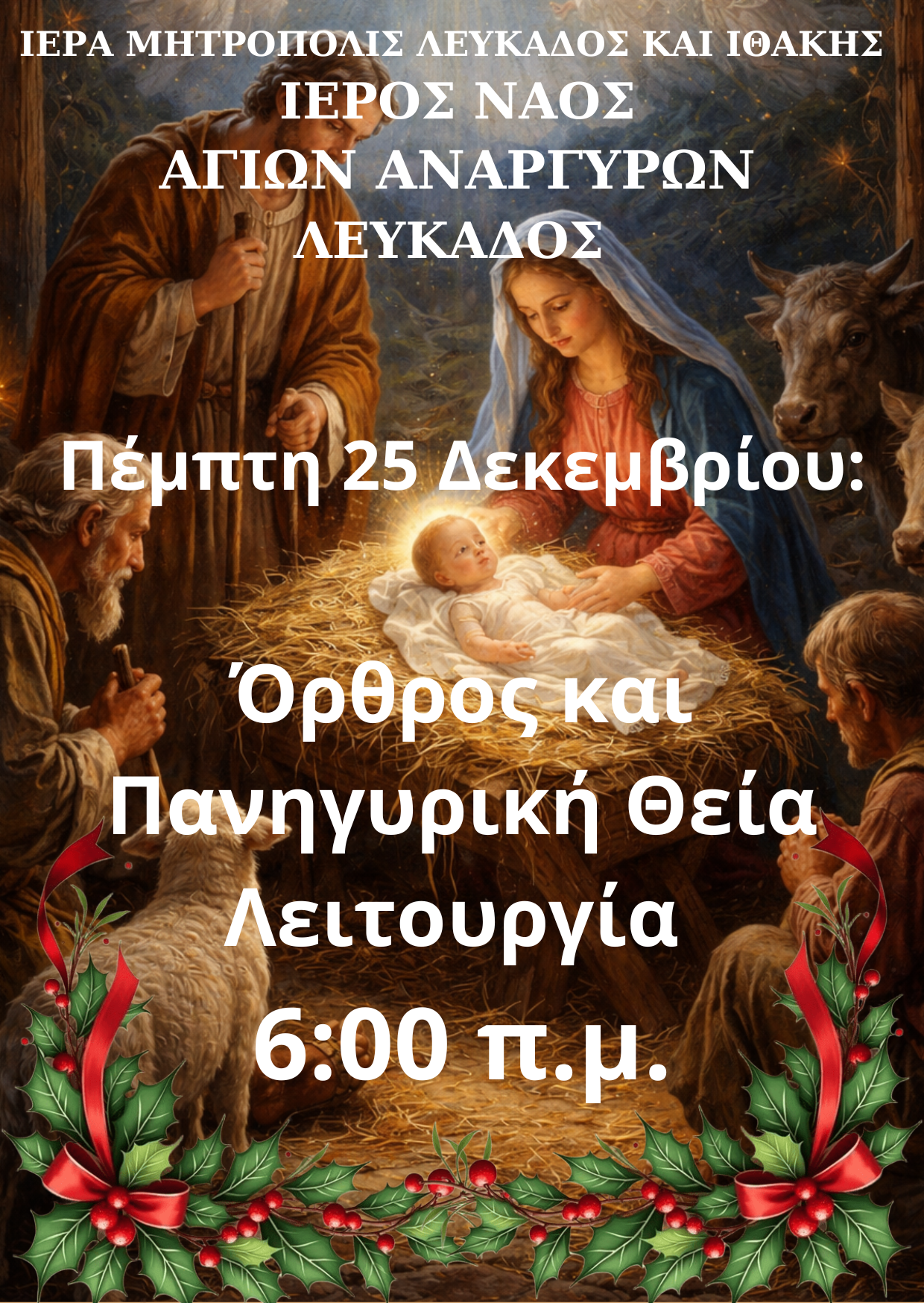 Στον Ιερό Ναό Αγίων Αναργύρων Κοσμά και Δαμιανού Λευκάδας θα τελεστούν ανήμερα της εορτής των Χριστουγέννων, από τις 6.00 π.μ., ο Όρθρος και η Πανηγυρική Θεία Λειτουργία των Χριστουγέννων.