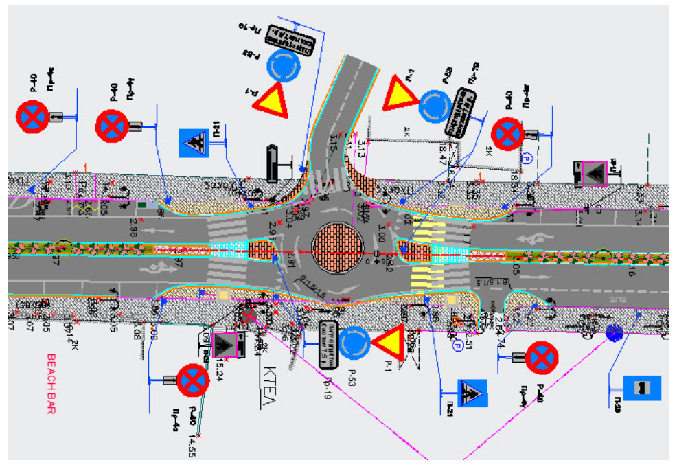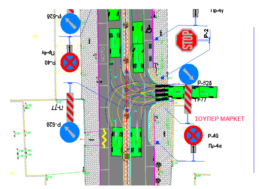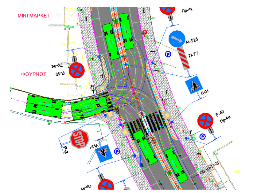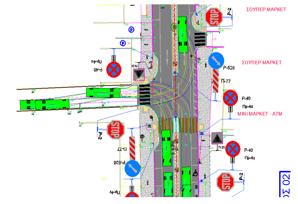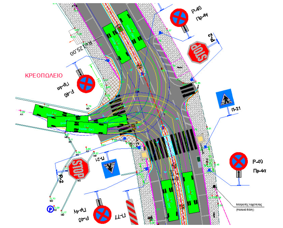 Κόμβος στη συμβολή του επαρχιακού δρόμου με το δημοτικό δρόμο για το λιμάνι (Οπισθοτροχιές στρεφουσών κινήσεων βαρέων οχημάτων μήκους 8μ)