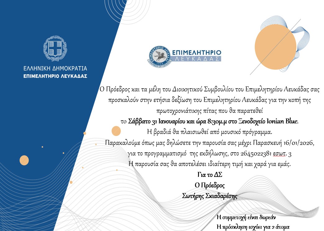Ο Πρόεδρος και τα μέλη του Διοικητικού Συμβουλίου του Επιμελητηρίου Λευκάδας σας προσκαλούν στην ετήσια δεξίωση του Επιμελητηρίου Λευκάδας για την κοπή της πρωτοχρονιάτικης πίτας που θα παρατεθεί το Σάββατο 31 Ιανουαρίου 2026 και ώρα 20:30 στο ξενοδοχείο Ionian Blue.