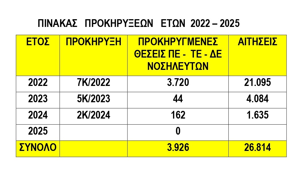 – Το 2023, στην προκήρυξη 5Κ/2023 για την κάλυψη 44 θέσεων βοηθών νοσηλευτών υποβλήθηκαν 4.084 αιτήσεις