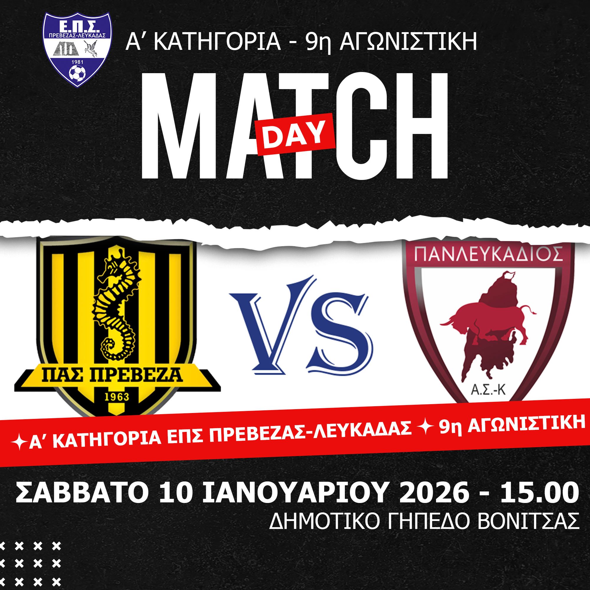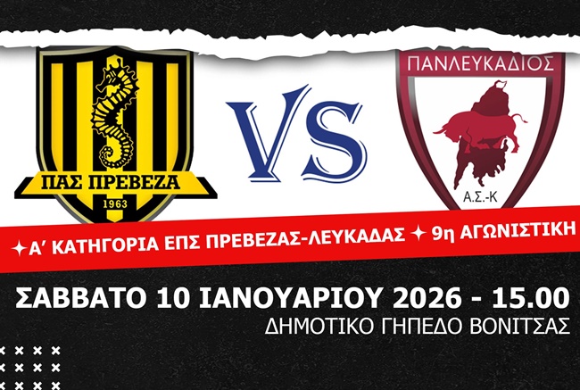 Σημαντική αναμέτρηση περιλαμβάνει το πρόγραμμα της 9ης αγωνιστικής του πρωταθλήματος της Α’ κατηγορία ΕΠΣ Πρέβεζας – Λευκάδας, με τον ΠΑΣ Πρέβεζα να υποδέχεται τον Πανλευκάδιο.