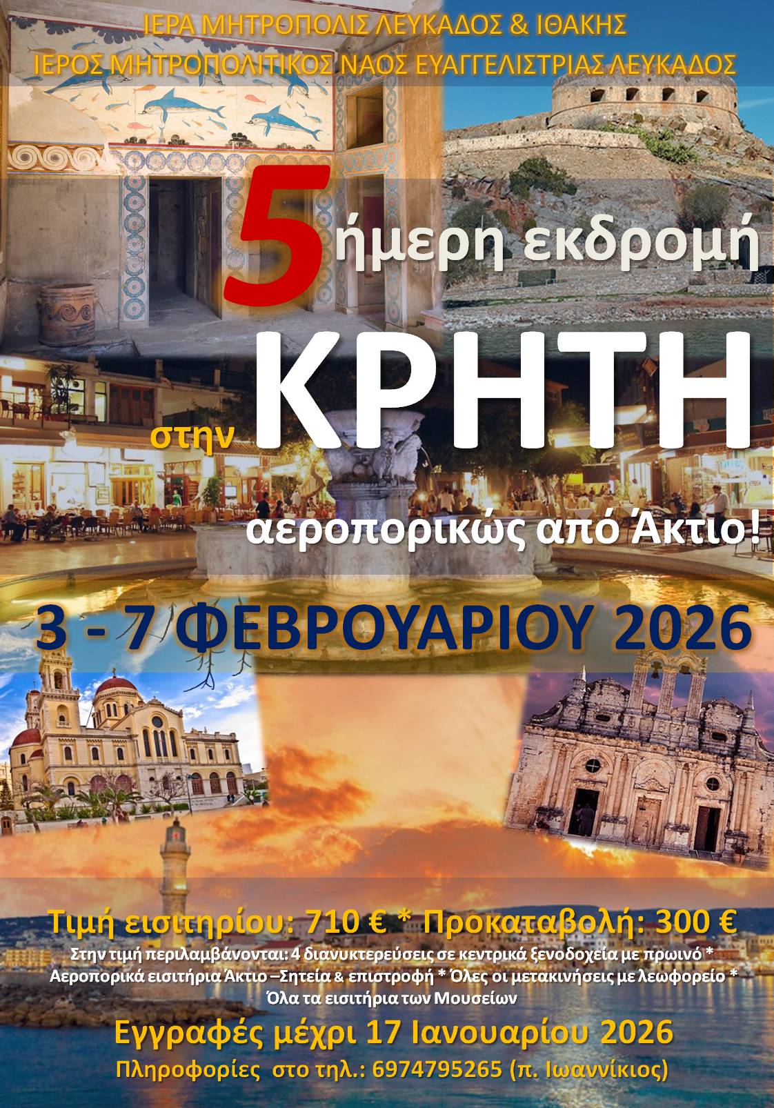 Γίνεται γνωστό ότι, με την ευλογία του Σεβασμιωτάτου Ποιμενάρχου μας κ. Θεοφίλου, η Ενορία Ευαγγελιστρίας (Μητροπόλεως) Λευκάδος προγραμματίζει πενθήμερη εκδρομή για ενήλικες στην ΚΡΗΤΗ την πρώτη εβδομάδα του Τριωδίου, από την ΤΡΙΤΗ 3 μέχρι και το ΣΑΒΒΑΤΟ 7 ΦΕΒΡΟΥΑΡΙΟΥ 2026.