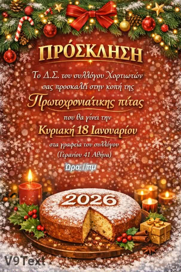 Πρόσκληση για την κοπή της Πρωτοχρονιάτικης πίτας 2026 του Συλλόγου Χορτιωτών