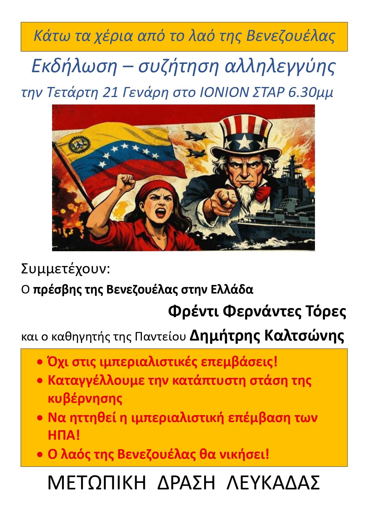 Εκδήλωση – συζήτηση αλληλεγγύης με σύνθημα «Κάτω τα χέρια από το λαό της Βενεζουέλας» διοργανώνει η Μετωπική Δράση Λευκάδας, την Τετάρτη 21 Γενάρη, στις 6:30 μ.μ., στο IONION STAR.