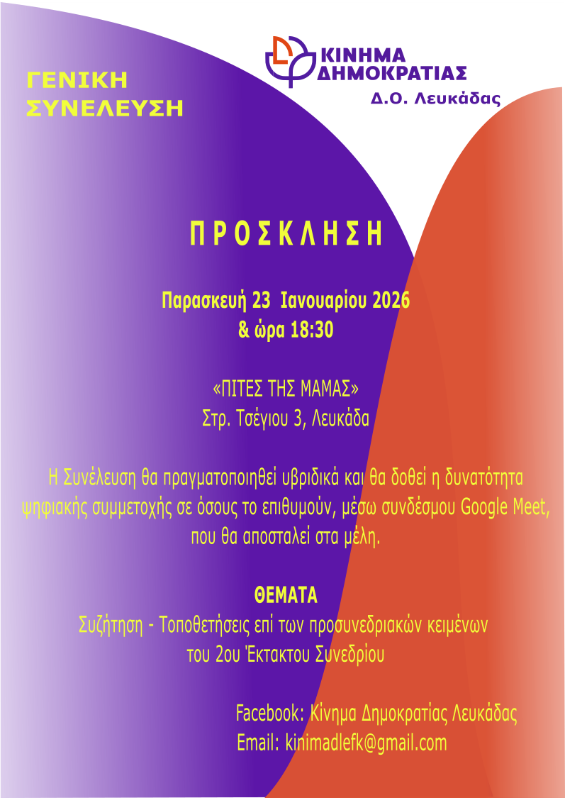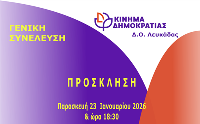 Το Κίνημα Δημοκρατίας – Δ.Ο. Λευκάδας απευθύνει πρόσκληση στα μέλη του για τη Γενική Συνέλευση που θα πραγματοποιηθεί την Παρασκευή 23 Ιανουαρίου 2026, στις 18:30.