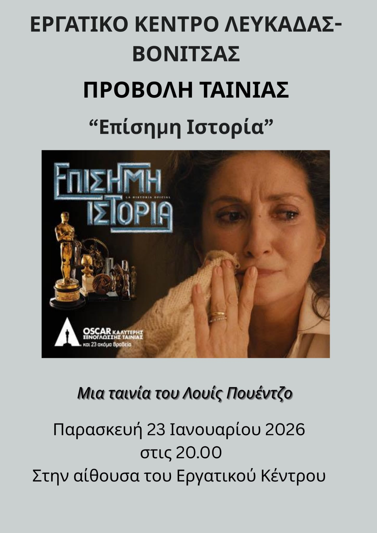 Αυτή την Παρασκευή στις 23 Ιανουαρίου 2026, στις 20.00, θα προβληθεί η ταινία «Επίσημη Ιστορία» του Λουίς Πουέντζο (1985, 112’), ιστορικό πολιτικό δράμα που εκτυλίσσεται μετά την πτώση του δικτάτορα Χόρχε Βιντέλα, το 1983.