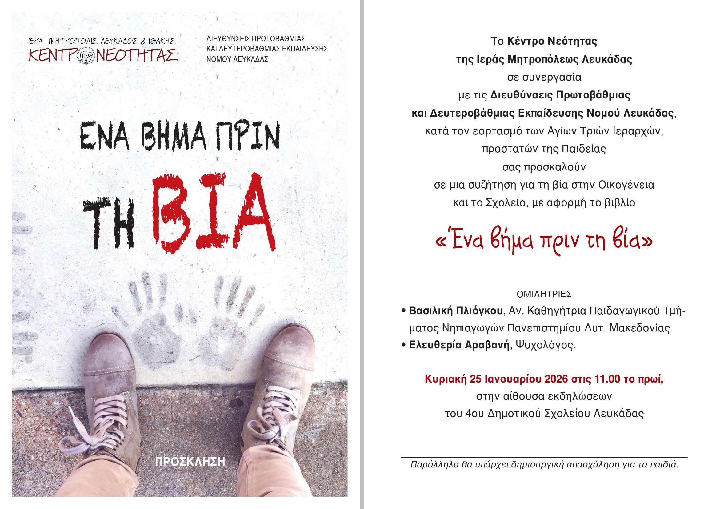 Εν όψει της εορτής των προστατών της Παιδείας μας, Αγίων Τριών Ιεραρχών το Κέντρο Νεότητας της Ιεράς Μητροπόλεώς μας και οι Διευθύνσεις Πρωτοβάθμιας και Δευτεροβάθμιας Εκπαίδευσης Λευκάδας συνδιοργανώνουν, όπως κάθε χρόνο, μία ανοιχτή συζήτηση – ημερίδα, με θέμα: «Ένα βήμα πριν τη Βία» την ερχόμενη Κυριακή 25 Ιανουαρίου 2026 και ώρα 11.00 π.μ., στην Αίθουσα Εκδηλώσεων του 4ου Δημοτικού Σχολείου Λευκάδας (οδ. Καποδιστρίου).