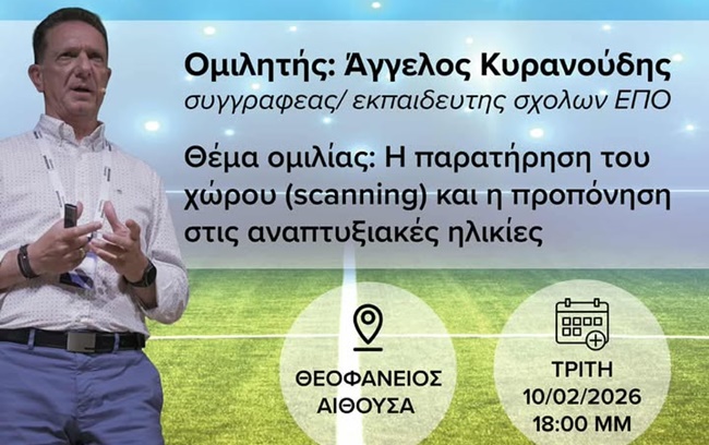 Ομιλητής: Άγγελος Κυρανούδης, συγγραφέας – εκπαιδευτής σχολών ΕΠΟ με θέμα ομιλίας: Η παρατήρηση του χώρου (scanning) και η προπόνηση στις αναπτυξιακές ηλικίες