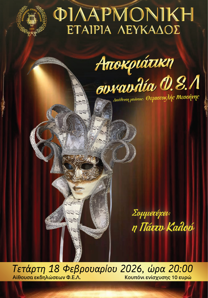 Η Φιλαρμονική Εταιρεία Λευκάδας προσκαλεί στην Αποκριάτικη συναυλία της που θα πραγματοποιηθεί την Τετάρτη 18-02-2026 και ώρα 20:00 στην αίθουσα εκδηλώσεων της Φ.Ε.Λ.