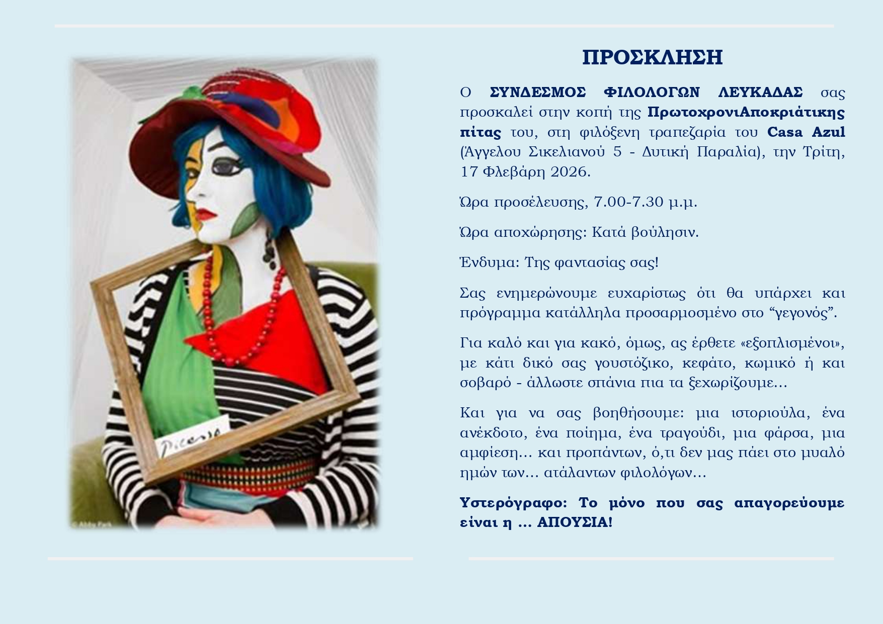 Ο ΣΥΝΔΕΣΜΟΣ ΦΙΛΟΛΟΓΩΝ ΛΕΥΚΑΔΑΣ σας προσκαλεί στην κοπή της ΠρωτοχρονιΑποκριάτικης πίτας του, στη φιλόξενη τραπεζαρία του Casa Azul (Άγγελου Σικελιανού 5 – Δυτική Παραλία), την Τρίτη, 17 Φλεβάρη 2026.