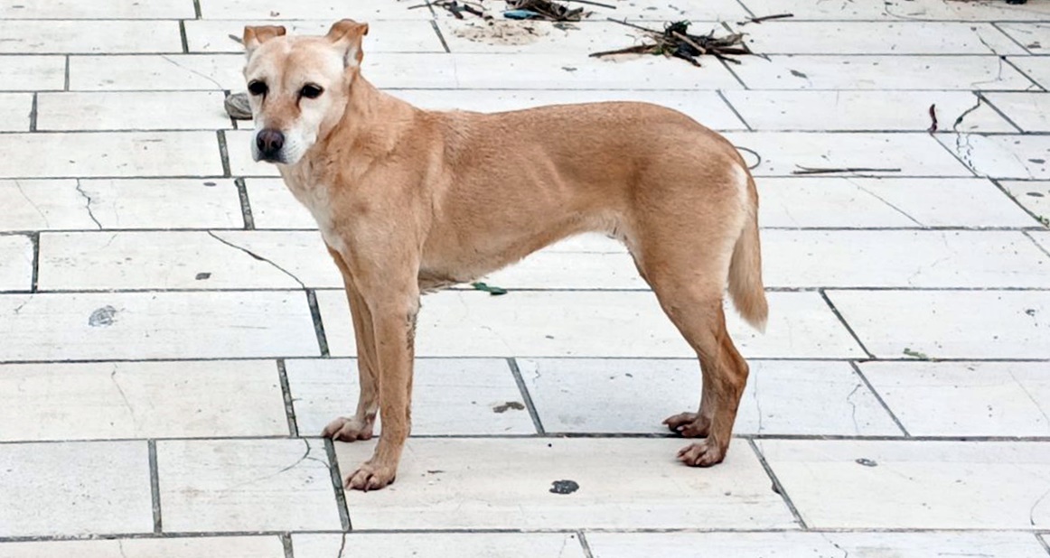 Δείχνει φοβισμένο και είναι αρκετά αδύνατο, αν και δεν γνωρίζουμε αν αυτό οφείλεται στη φυσιολογία του. Δεν φέρει περιλαίμιο και δεν γνωρίζουμε αν είναι αδέσποτο ή αν έχει χαθεί.
