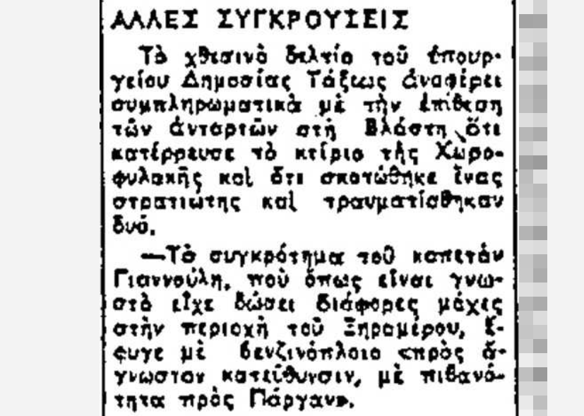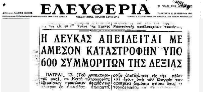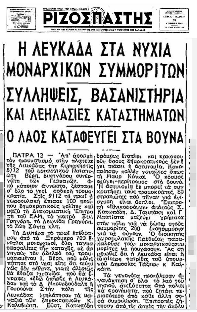 9_arxhgeio_dse_Lefkadas_Akarnanias«ΕΛΕΥΘΕΡΙΑ» , Φύλλο της Παρασκευής 13 Δεκεμβρίου 1946. «… Ο επί κεφαλής των ενόπλων Ι. Βέρης αδελφός του τραυματισθέντος διεκήρυξεν δημοσία ότι αν ο αδελφός του αποθάνη λόγω των τραυμάτων, ούτος θα ανασκάψη εκ θεμελίων την πόλιν και θα αναγράψη επί πινακίδος: «Εδώ ήτο η Λευκάς» όπως έπραξαν οι Γερμανοί εις Κάνδαμον»…»