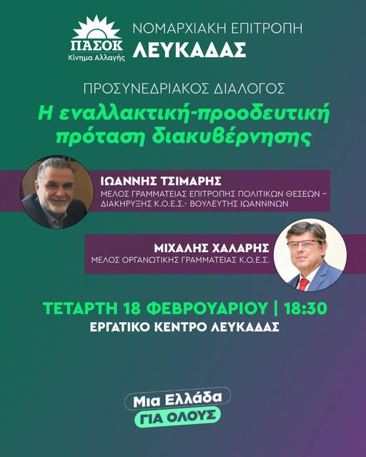 H Ν.Ο.Ε.Σ ΠΑΣΟΚ – Κίνημα Αλλαγής Λευκάδας, σας προσκαλεί στην εκδήλωση του Προσυνεδριακού Διαλόγου “Εναλλακτική-Προοδευτική Πρόταση Διακυβέρνησης” που θα πραγματοποιηθεί αύριο Τετάρτη 18.02.2026 στις 18:30, στην αίθουσα του Εργατικού Κέντρου Λευκάδας.