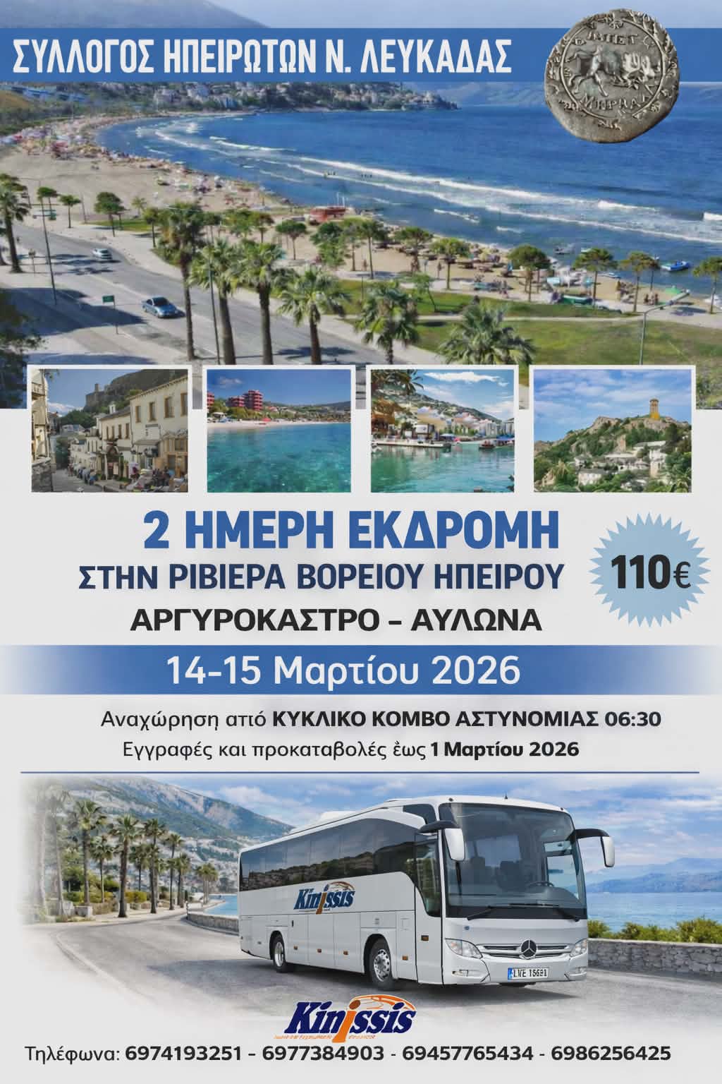 Ο Σύλλογος Ηπειρωτών Ν. Λευκάδας διοργανώνει 2ήμερη εκδρομή στη Ριβιέρα Βορείου Ηπείρου, με προορισμούς το Αργυρόκαστρο και την Αυλώνα, στις 14–15 Μαρτίου 2026.
