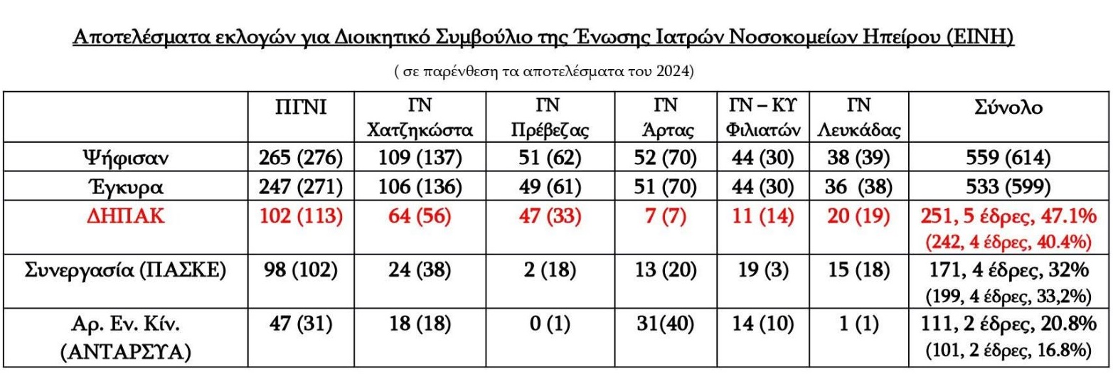 Τόσο στο Γενικό Νοσοκομείο Λευκάδας όσο και συγκεντρωτικά σε όλα τα Νοσοκομεία Ηπείρου-Λευκάδας πρώτη δύναμη αναδείχτηκε η «Δημοκρατική Πανεπιστημονική Κίνηση» Γιατρών (ΔΗΠΑΚ), η οποία αύξησε τους ψήφους της και κερδίζει 5 έδρες, 1 έδρα παραπάνω συγκριτικά με τα αποτελέσματα των εκλογών του 2024.