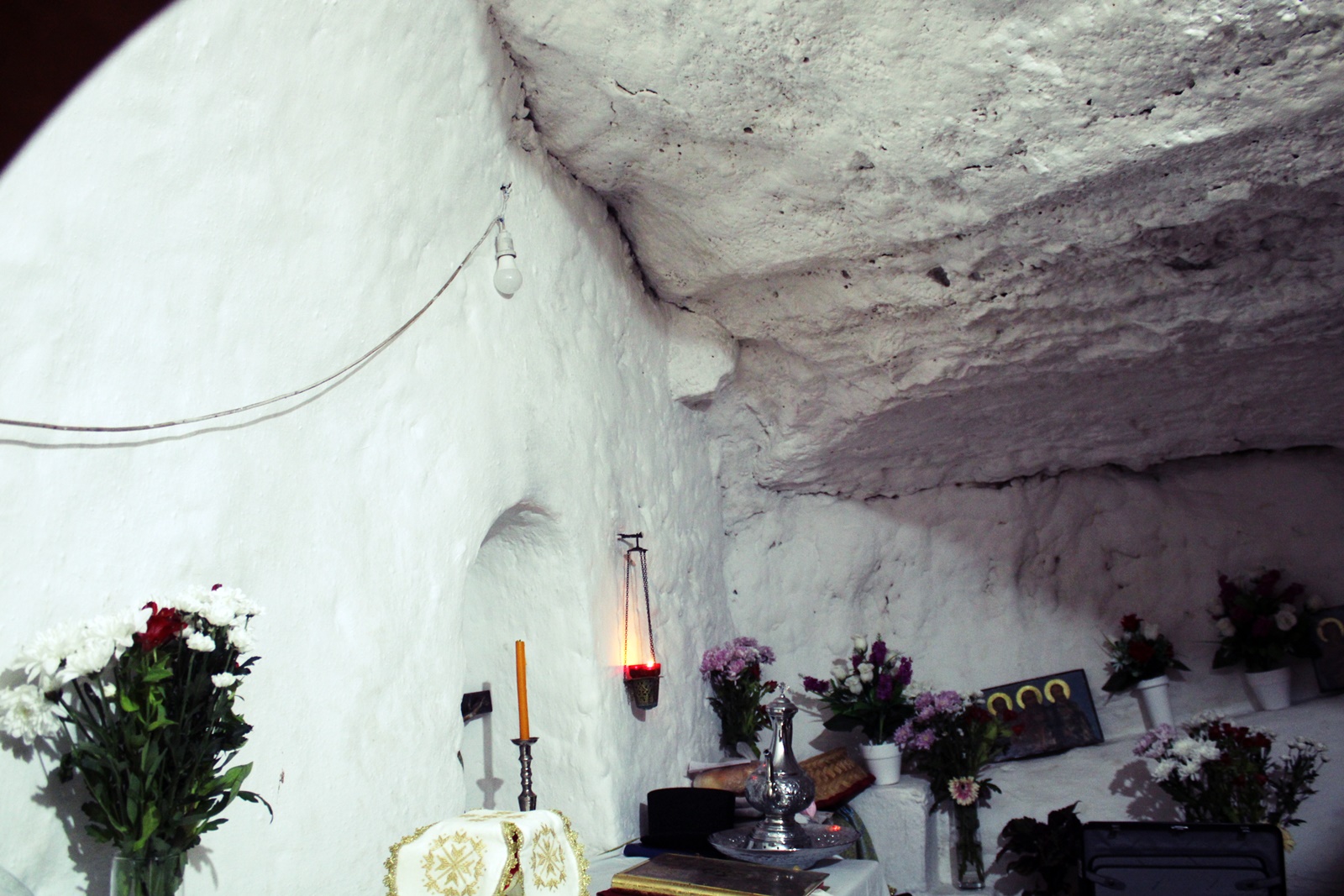 Κοντά στην κορυφή, σε μια εσοχή του βράχου, υπήρχε ένα μικρό παρεκκλήσι, κατασκευασμένο προς τιμήν τριών αγίων, των οποίων τα πορτρέτα είχαν κάποτε ζωγραφιστεί σε τρεις μικρές σανίδες που κρέμονταν μπροστά από την Αγία Τράπεζα. Από τις ζωγραφιές δεν είχε απομείνει τίποτε άλλο παρά μόνο τμήματα από τους επιχρυσωμένους φωτοστέφανους που άλλοτε περιέβαλλαν τα κεφάλια των αγίων. Όλα τα υπόλοιπα είχαν από καιρό «σβηστεί» από τα φιλιά των πιστών· όμως οι σύντροφοί μου, όπως και πολλοί άλλοι, εξακολουθούσαν με μεγάλη ευλάβεια να ασπάζονται τις λερωμένες σανίδες.