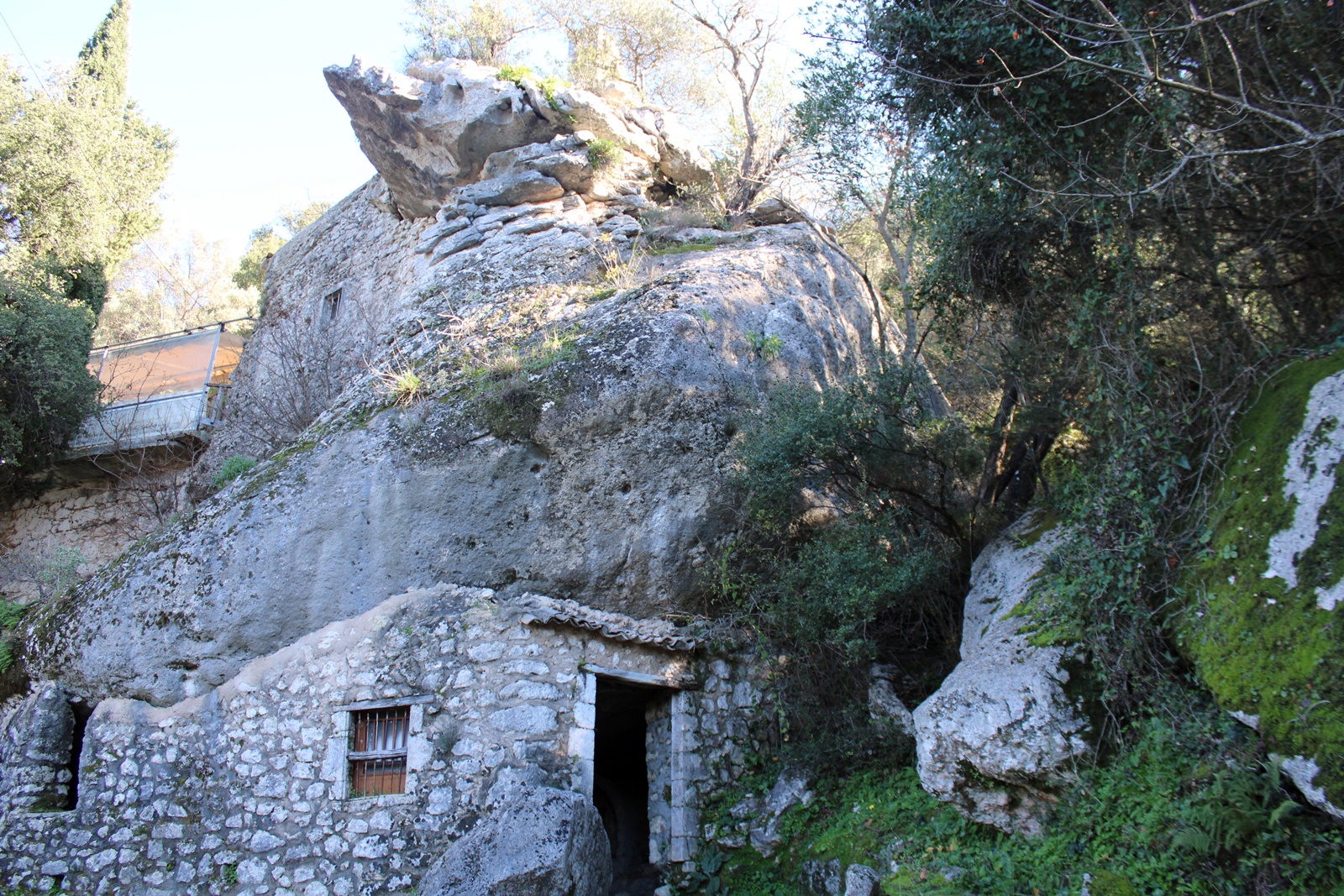 «Αφού αποχαιρέτησα τους φίλους μου, τους μοναχούς, επέστρεψα από τους Σκάρους στην πόλη από έναν μικρότερο και πιο απότομο δρόμο από αυτόν από τον οποίο είχα έρθει και, στο δρόμο, σταμάτησα για να παρατηρήσω έναν πολύ εντυπωσιακό και γραφικό όγκο του κροκαλοπαγούς των λόφων, που είχε καταπέσει και προεξείχε από την πλαγιά του βουνού με παράξενο τρόπο. Το εκτεθειμένο τμήμα αυτού του τεράστιου βράχου, καθώς προβάλλει από το έδαφος, είχε εμβαδόν πενήντα τετραγωνικά πόδια και σχεδόν είκοσι πόδια πάχος. Κάτω από αυτόν υπήρχε ένας μεγάλος χώρος, που είχε χτιστεί περιμετρικά ώστε να χρησιμεύει ως υπόστεγο για ζώα, με μέρος του ίδιου του βράχου να σχηματίζει τη στέγη.