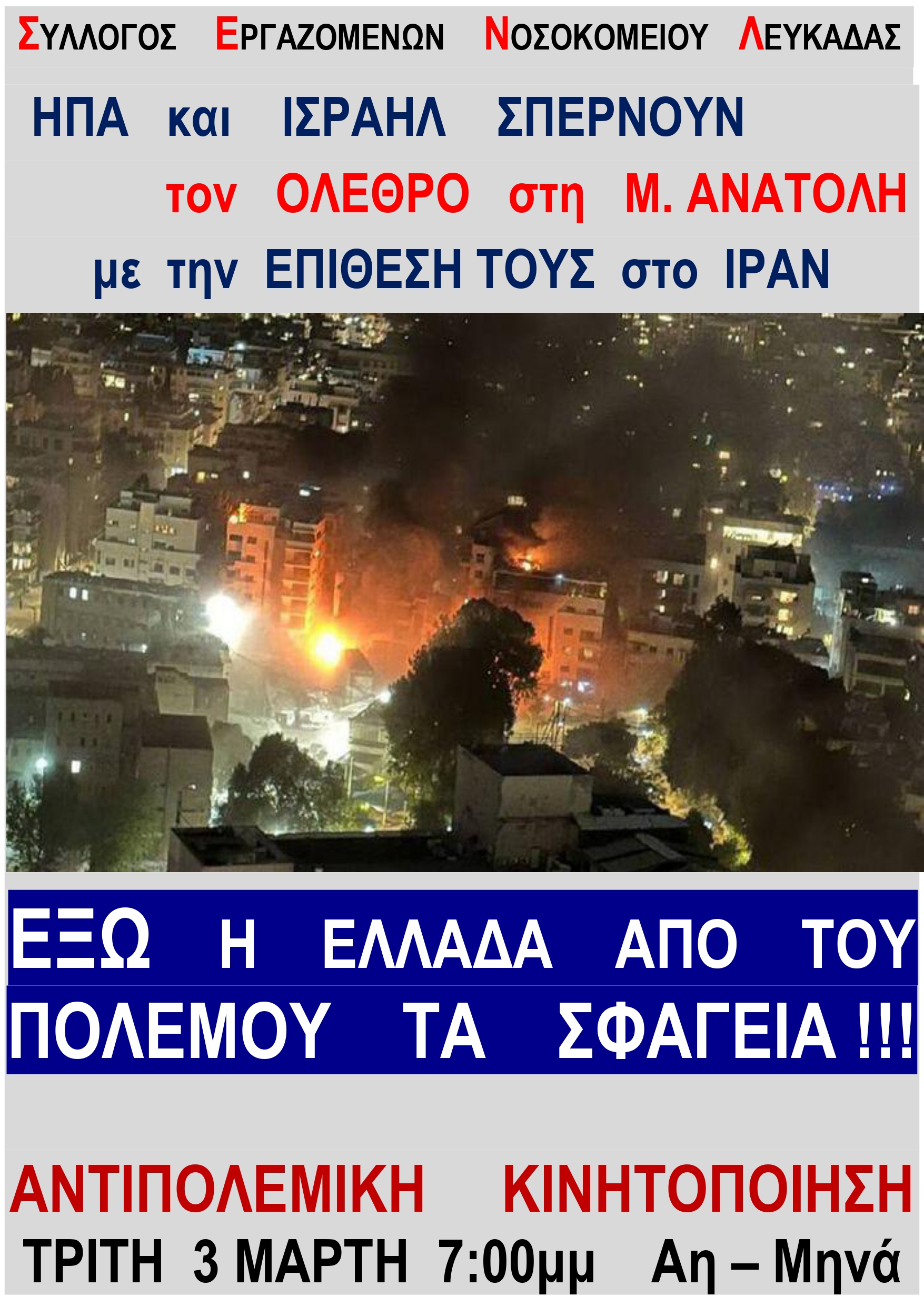 Κάλεσμα του Συλλόγου Εργαζομένων Νοσοκομείου Λευκάδας στην αντιπολεμική κινητοποίηση