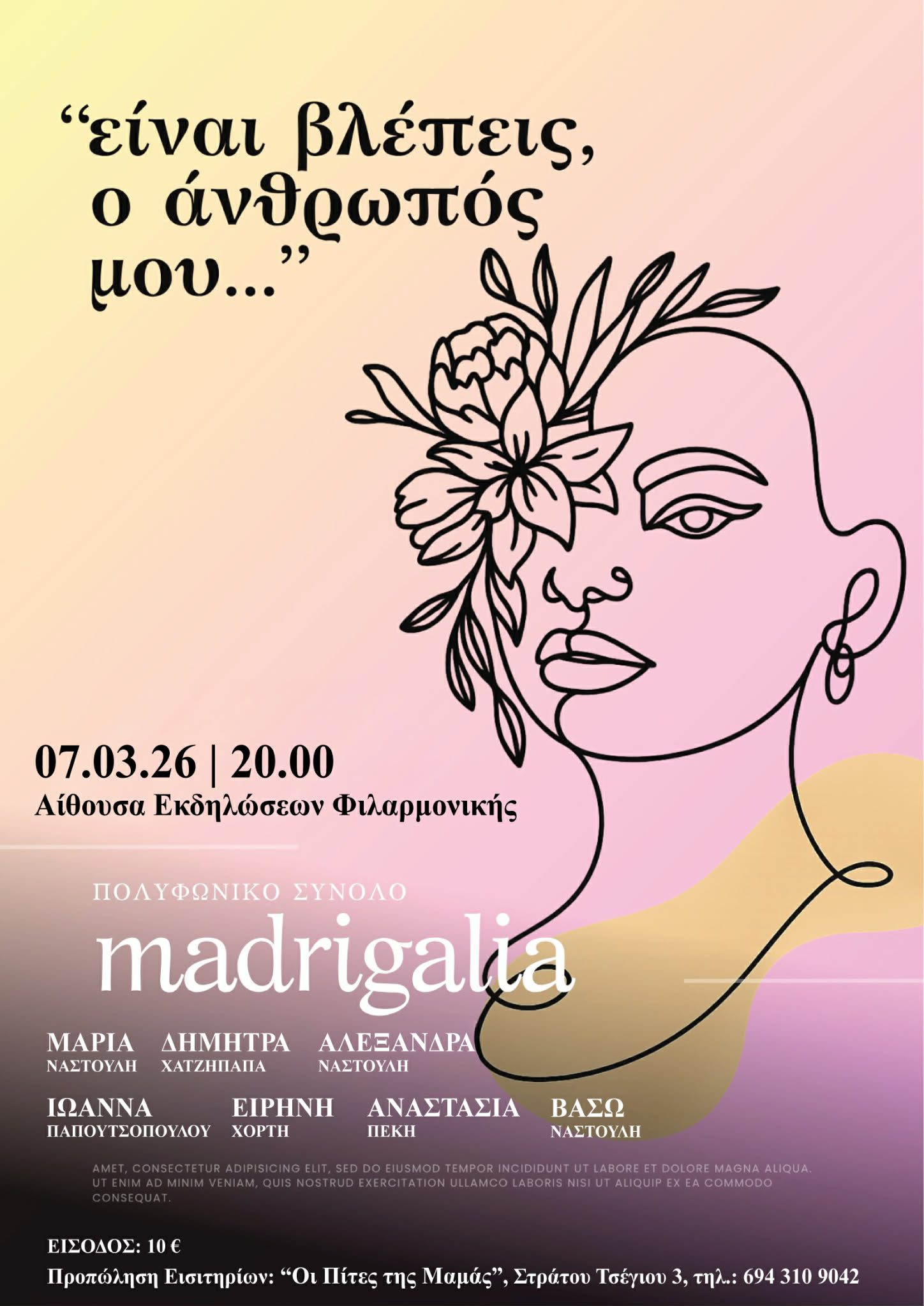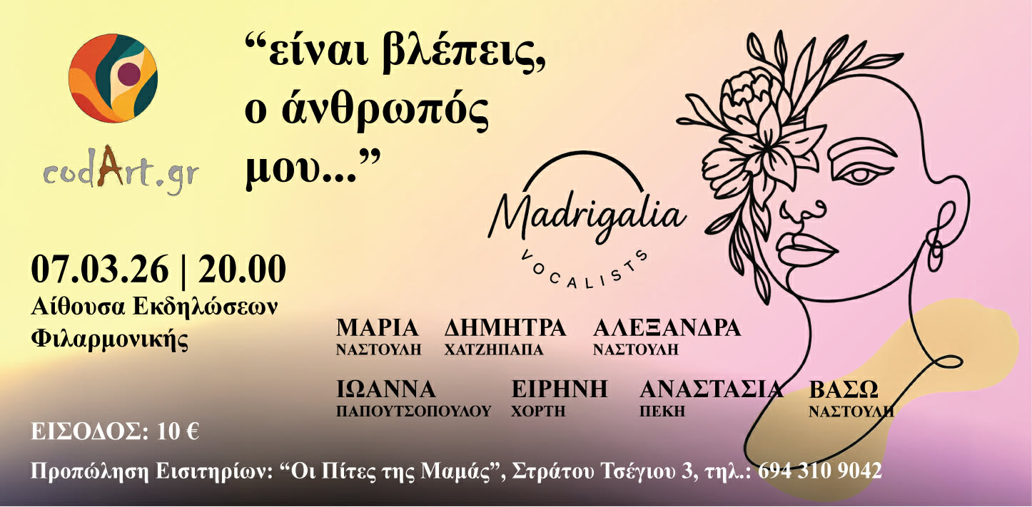 Μια ξεχωριστή μουσική βραδιά με τίτλο «είναι βλέπεις, ο άνθρωπός μου…» παρουσιάζει το πολυφωνικό σύνολο Madrigalia, το Σάββατο 7 Μαρτίου 2026 και ώρα 20:00, στην Αίθουσα Εκδηλώσεων της Φιλαρμονικής.