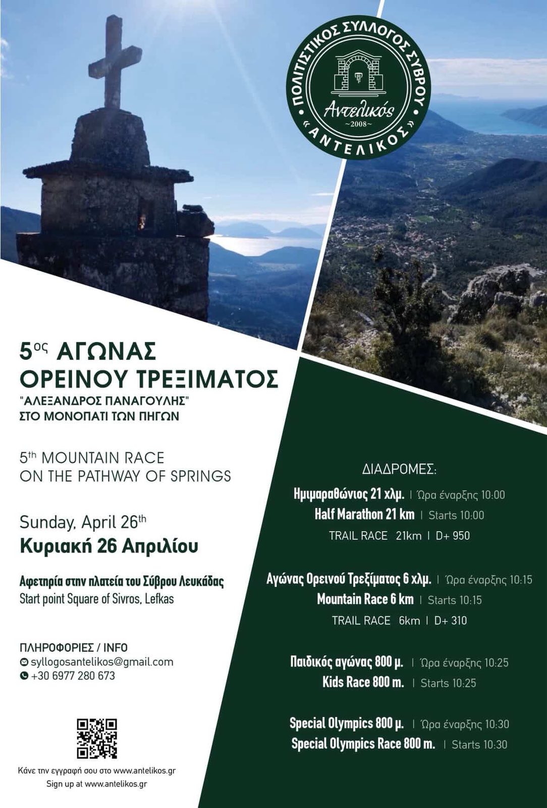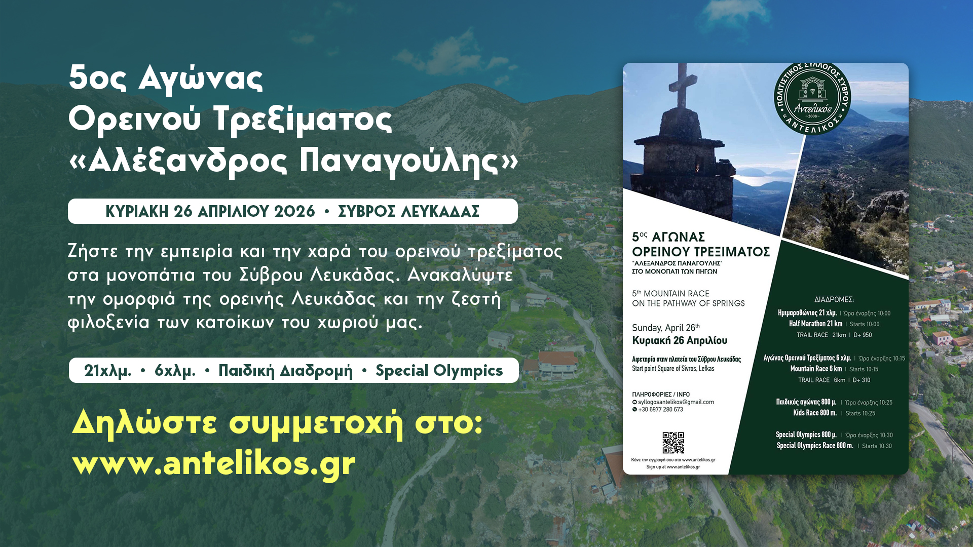 Ο Πολιτιστικός Σύλλογος Σύβρου Λευκάδας «Αντελικός» ανακοινώνει με χαρά τη διεξαγωγή του 5ου Αγώνα Ορεινού Τρεξίματος «Αλέξανδρος Παναγούλης» – «Στο μονοπάτι των πηγών», ο οποίος θα πραγματοποιηθεί την Κυριακή 26 Απριλίου 2026.