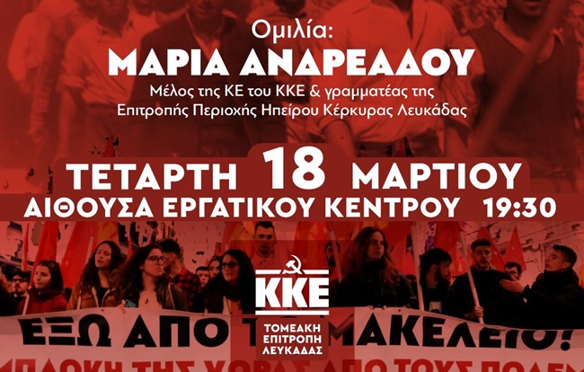 Εκδήλωση – πολιτική συζήτηση με θέμα «Σε έναν κόσμο που φλέγεται, ο λαός μπορεί να γίνει πρωταγωνιστής με το ΚΚΕ μπροστά» διοργανώνει η Τομεακή Επιτροπή Λευκάδας του ΚΚΕ την Τετάρτη 18 Μαρτίου, στις 19:30, στην αίθουσα του Εργατικού Κέντρου Λευκάδας.