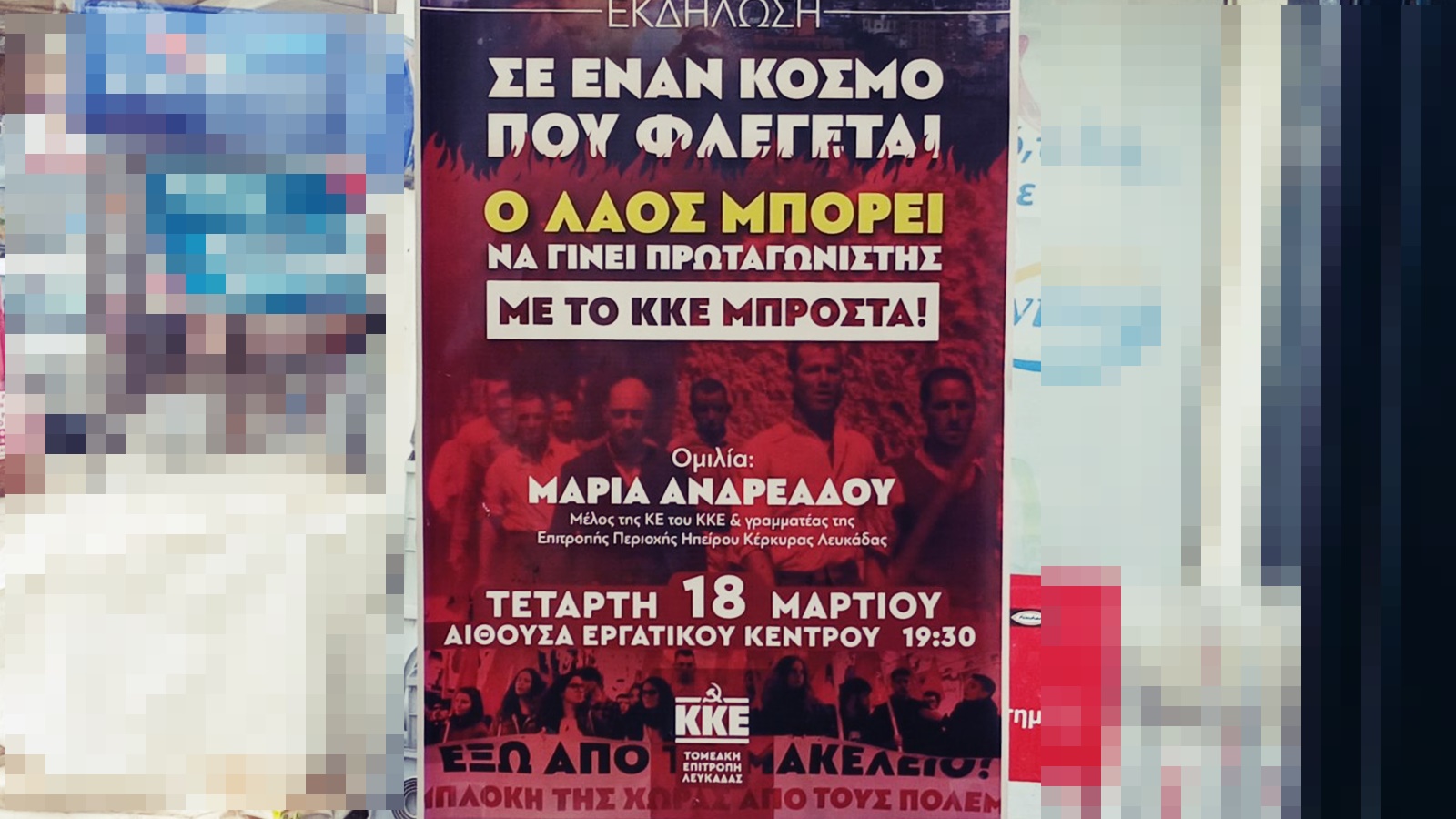 Σήμερα, Τετάρτη 18 Μαρτίου, στις 19:30, στην αίθουσα του Εργατικού Κέντρου Λευκάδας, θα πραγματοποιηθεί η εκδήλωση – πολιτική συζήτηση με θέμα «Σε έναν κόσμο που φλέγεται, ο λαός μπορεί να γίνει πρωταγωνιστής με το ΚΚΕ μπροστά» που διοργανώνει η Τομεακή Επιτροπή Λευκάδας του ΚΚΕ.