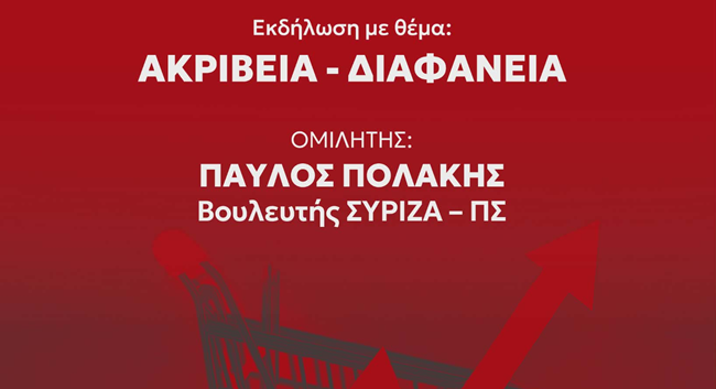 Κεντρικός ομιλητής θα είναι ο Βουλευτής & Τομεάρχης Διαφάνειας του ΣΥΡΙΖΑ-ΠΣ ΠΑΥΛΟΣ ΠΟΛΑΚΗΣ, ο οποίος θα αναλύσει τις πολιτικές εξελίξεις, τα πραγματικά αίτια της ακρίβειας και την ανάγκη για λογοδοσία, διαφάνεια και δικαιοσύνη στη δημόσια ζωή.