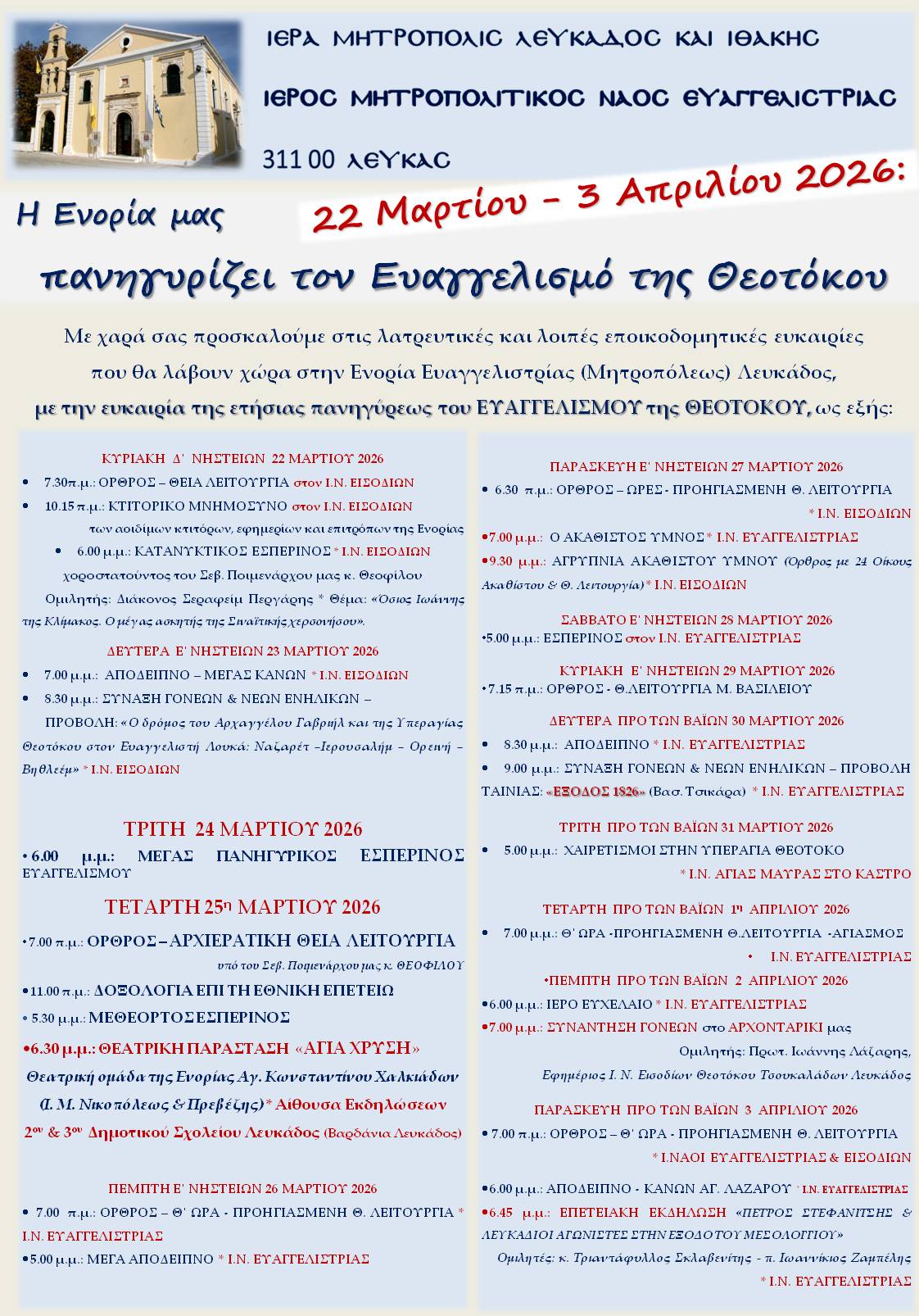 Γίνεται γνωστό ότι στην Ενορία Ευαγγελιστρίας (Μητροπόλεως) Λευκάδος, με την ευκαιρία της ετήσιας πανηγύρεως του ΕΥΑΓΓΕΛΙΣΜΟΥ της ΘΕΟΤΟΚΟΥ, θα λάβουν χώρα λατρευτικές ευκαιρίες και λοιπές εποικοδομητικές εκδηλώσεις σύμφωνα με το εξής πρόγραμμα: