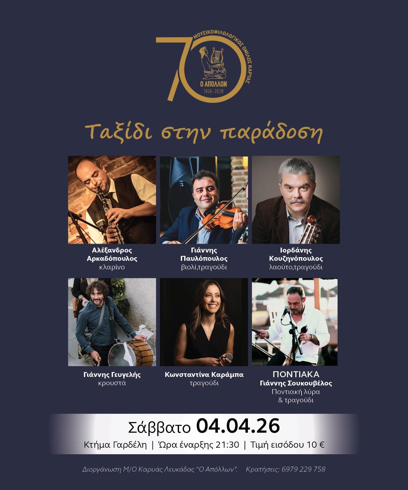 Το Διοικητικό συμβούλιο του Μουσικοφιλολογικού Ομίλου «Ο Απόλλων» Καρυάς σας προσκαλεί το Σάββατο 4 Απριλίου και ώρα 21:30 στο κτήμα Γαρδέλη σε ένα μουσικο-χορευτικό ταξίδι στην παράδοση μας…